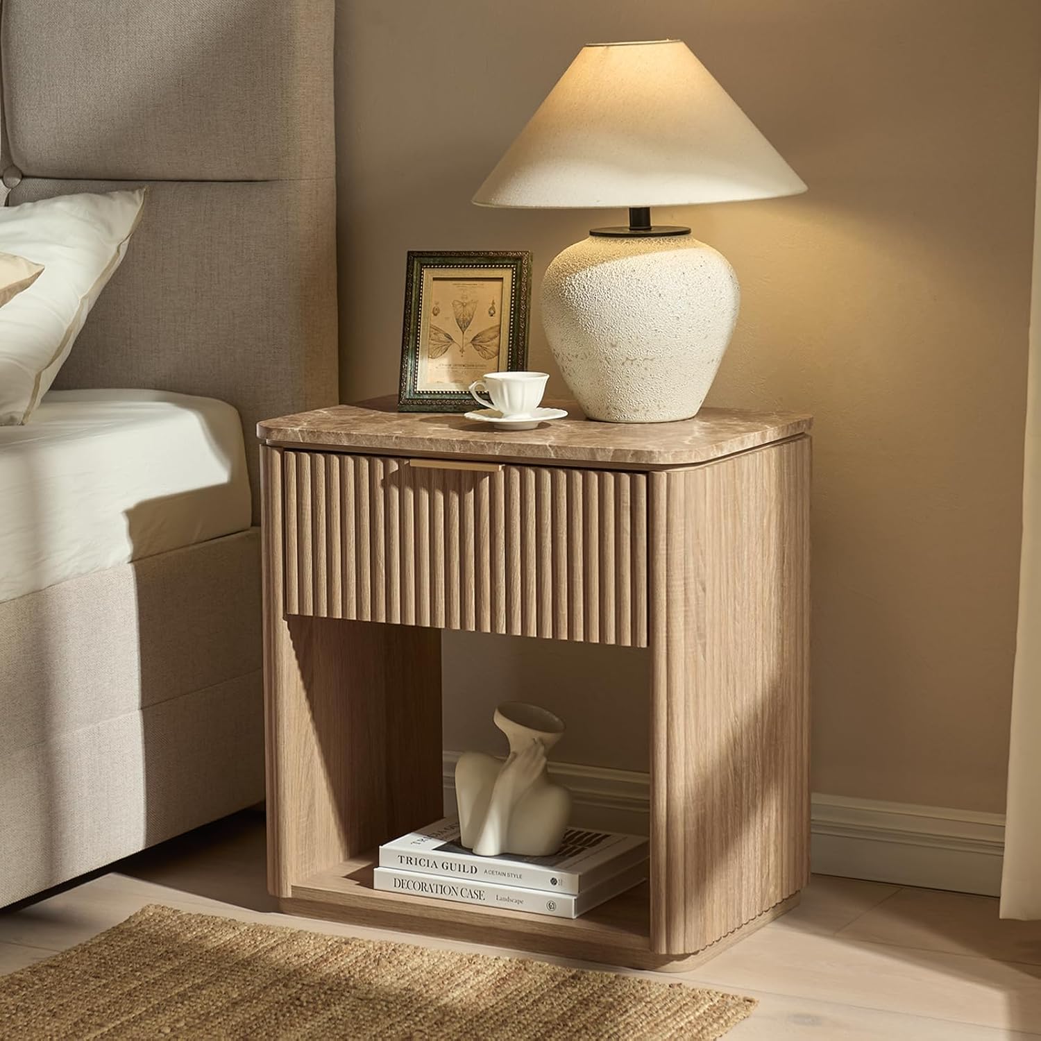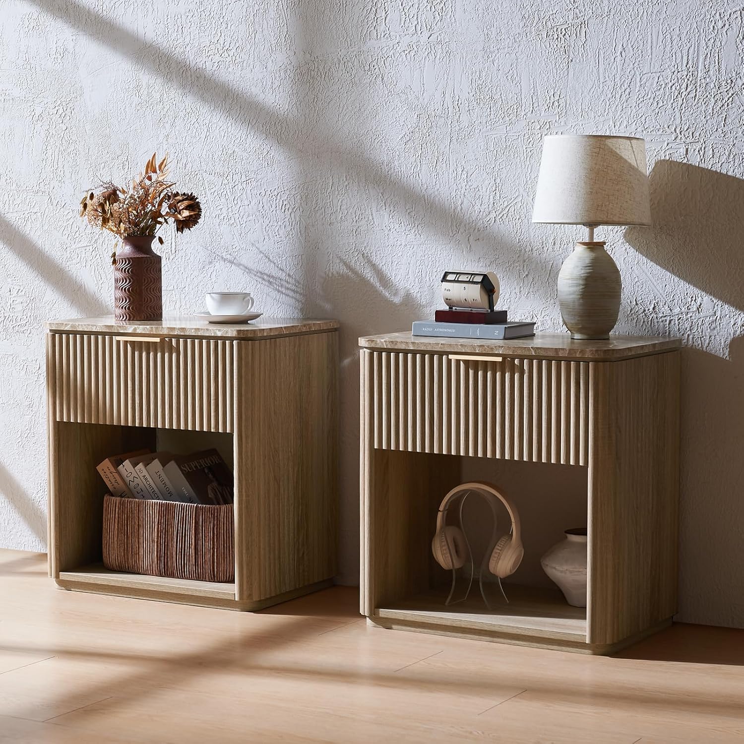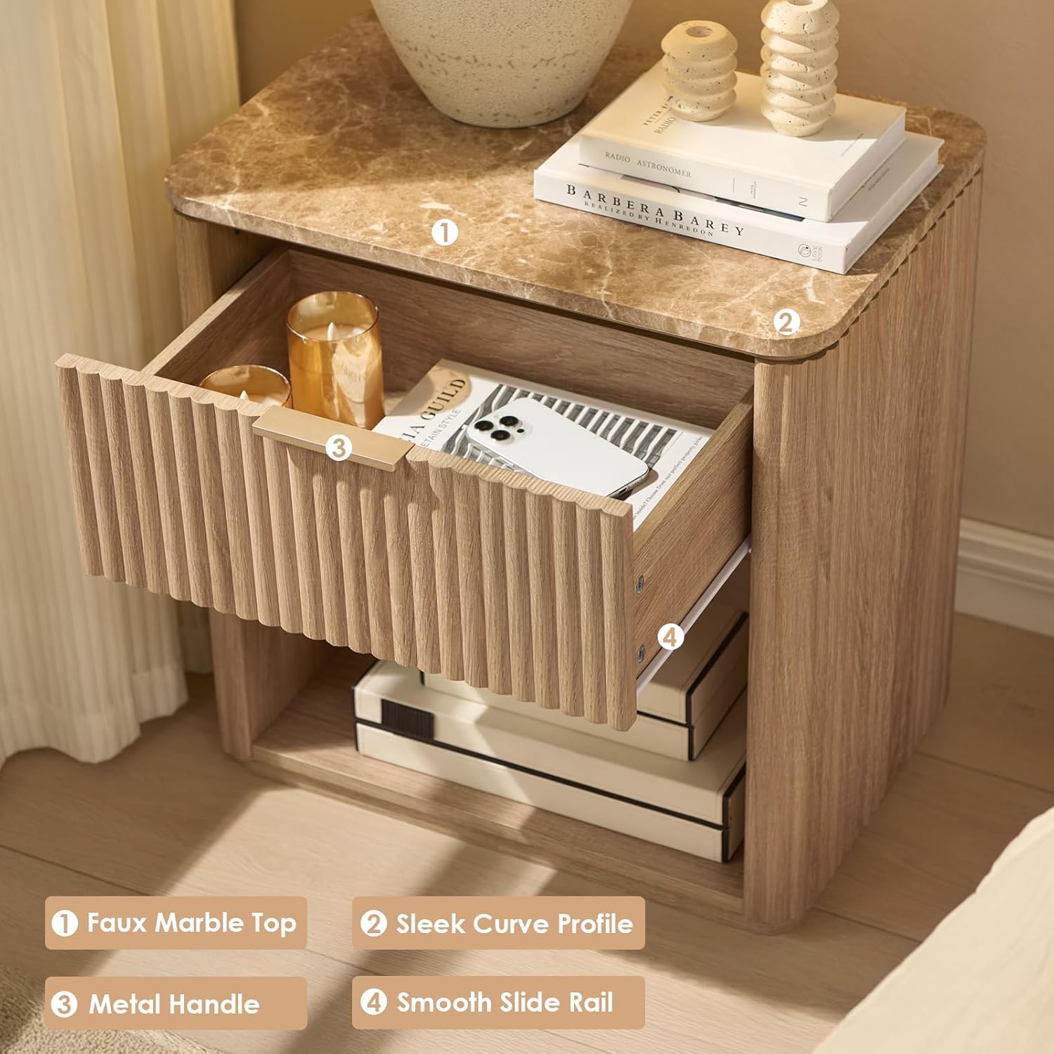 Modern Style with a Warm Touch – Designed with wave-textured panels on both sides and the drawer front, this fluted nightstand features a natural oak finish and champagne gold handle, blending sleek modern design with subtle farmhouse charm. Whether next to your bed, beside a sofa, or in a cozy reading nook, it adds an elegant, eye-catching touch to your spaces
