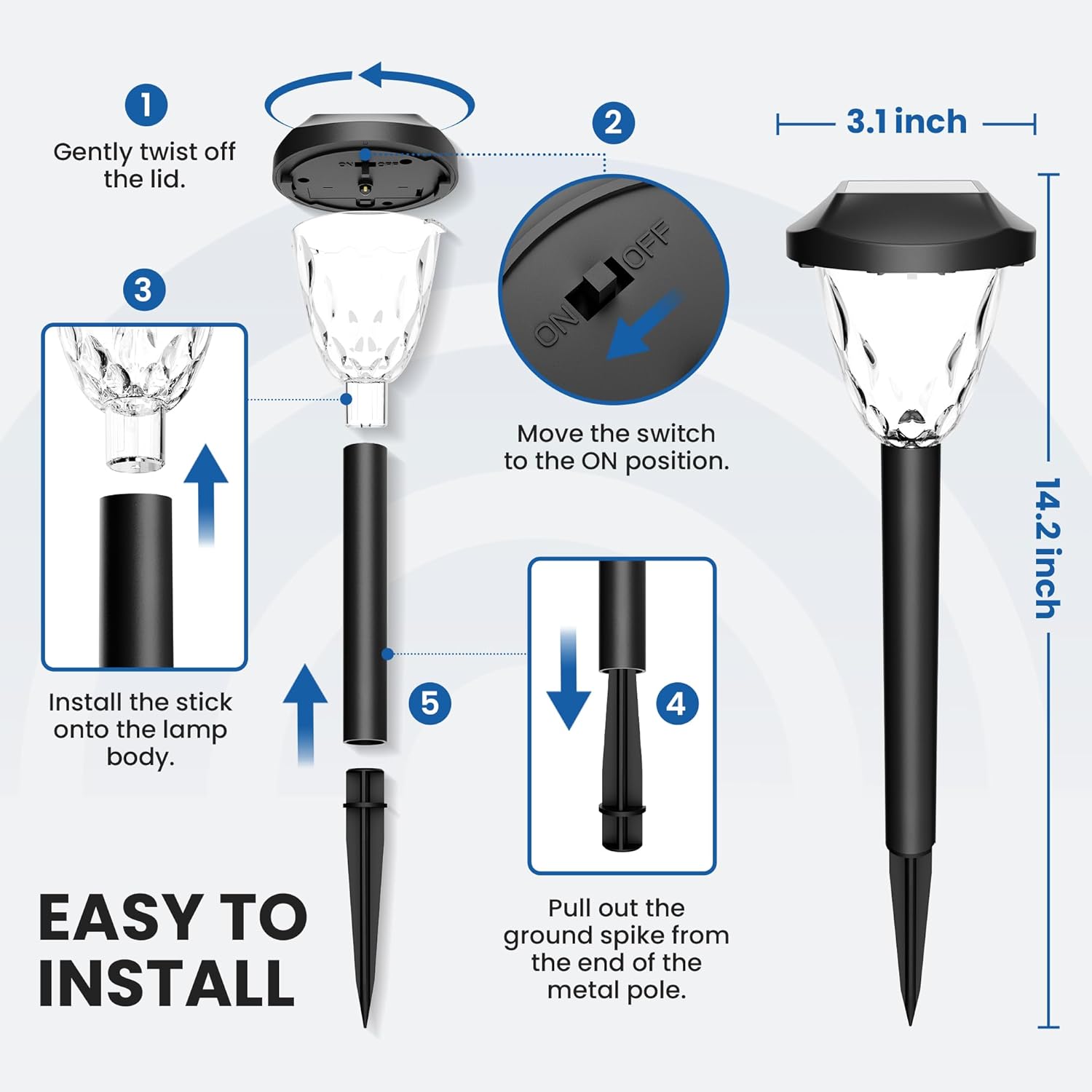 【Easy Installation and Use】Installing these solar garden lights is easy and requires no additional tools. Simply push these solar walkway lights into the ground for quick installation. It only takes a few seconds to complete. Before using the solar outdoor lights, cover the panel with your hand to check if the light is working