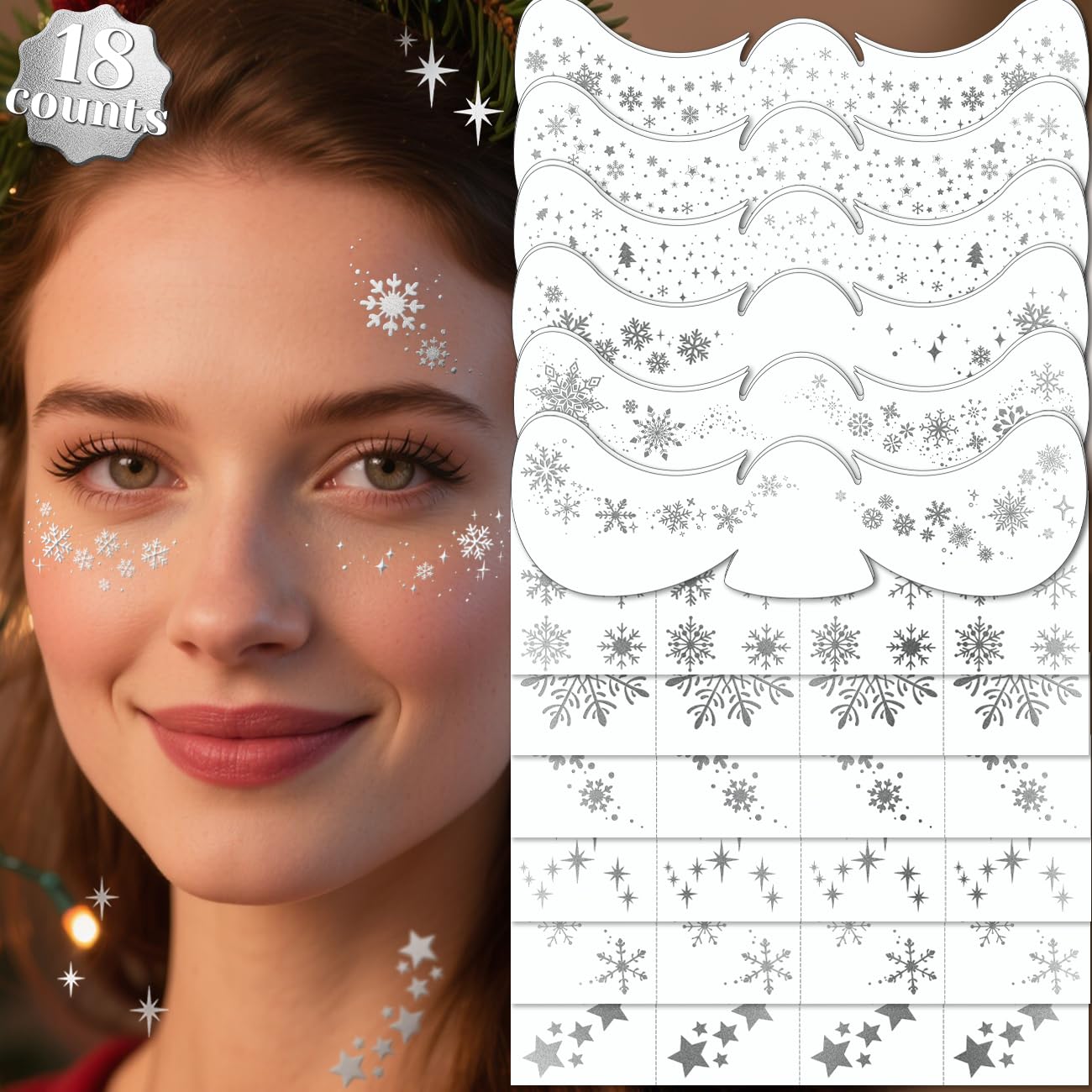 ⚡Set Includes 36Pcs Glitter Christmas Styles Freckles Tattoo for Christmas Party Supplies– Silver glitter Snowflake freckles adds a dazzling touch to any makeup look, creating a strong festive atmosphere. Each pack contains 12 Big Pacthes+24 Mini Patches.