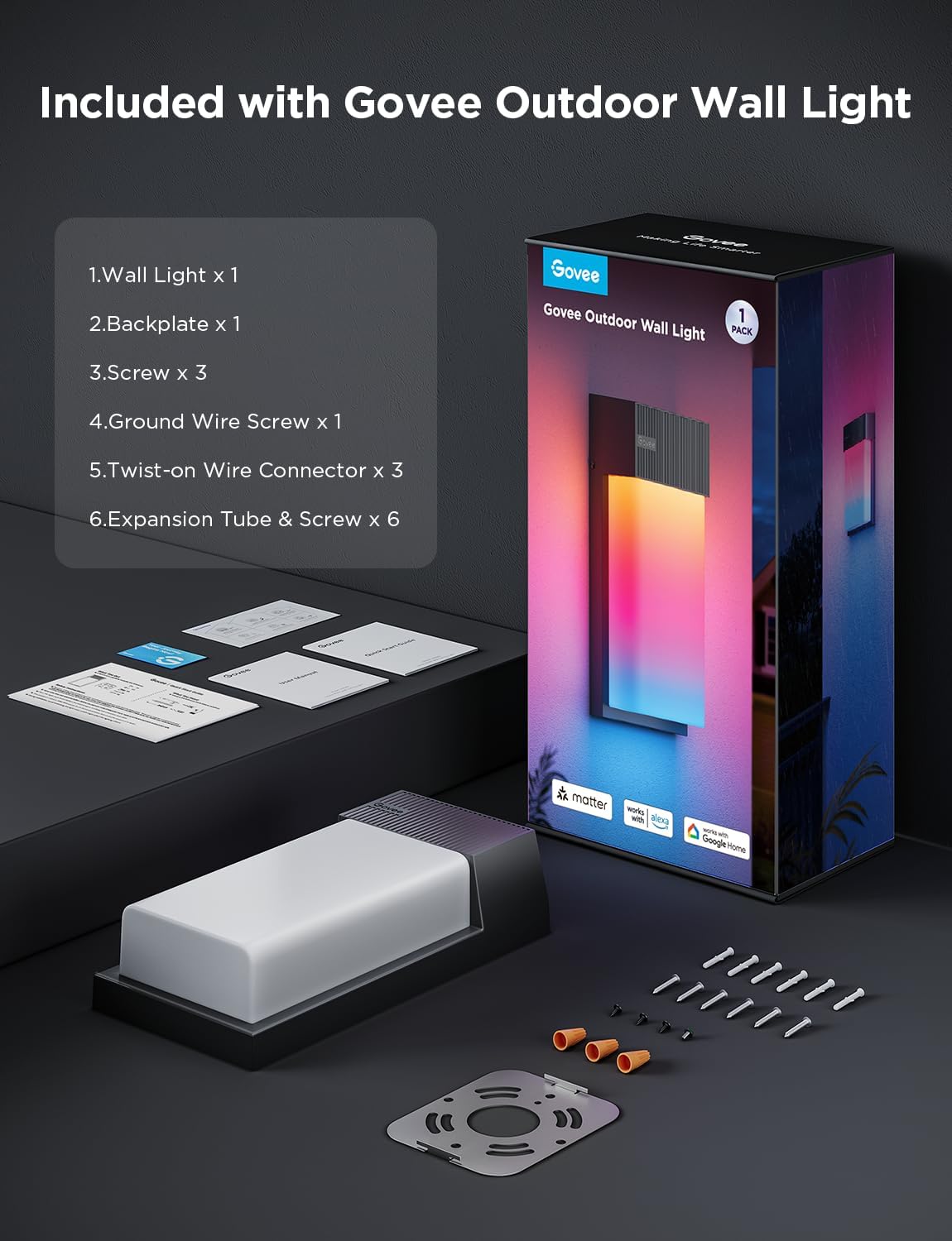 Dream-like Lighting Effects: Govee outdoor wall lights can simultaneously display at least 3 colors horizontally. Enjoy a flexible DIY experience and 45 immersive scene modes for creative outdoor decoration.