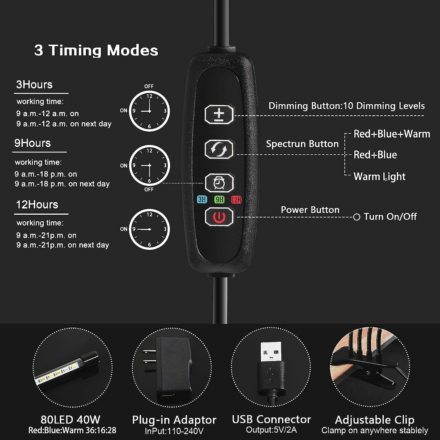 Grow Light for Indoor Plants – Upgraded Version 80 LED Lamps with Full Spectrum & Red Blue Spectrum, 3/9/12H Timer, 10 Dimmable Level, Adjustable Gooseneck,3 Switch Modes