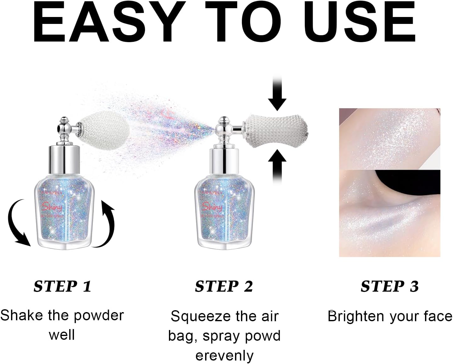 【Shimmering Highlighter Powder Spray】The highlighter powder spray combines multiple glitter particle for a multi-dimensional, diamond-like sparkle.