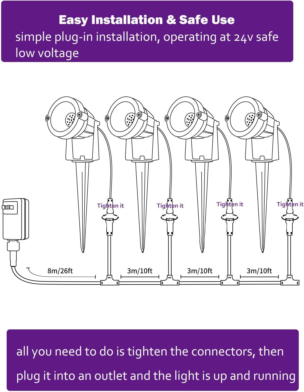 Easy to Install, Plug and Play: This low voltage landscape lighting kit includes all you need (package include 4x 6w low voltage landscape lights, 1x 36w transformer, 1x low voltage wire with connectors, 1x remote), just connect the each light to the main cable, then plug it and play. They can be widely used to decorate your court yard, tree, house, fence, Halloween, Christmas, wedding etc.