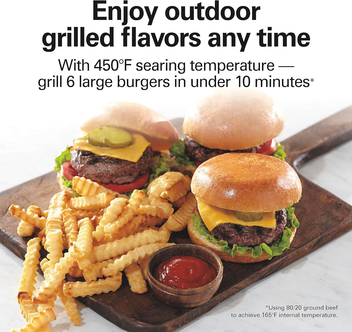 HIGH SEARING TEMPERATURE FOR OUTDOOR GRILLED FLAVORS: The nonstick, ribbed grill plate achieves 450°F searing temperature so you can enjoy the look and taste of your favorite grilled foods year-round. Grills six 4 oz. hamburgers in under 10 minutes.