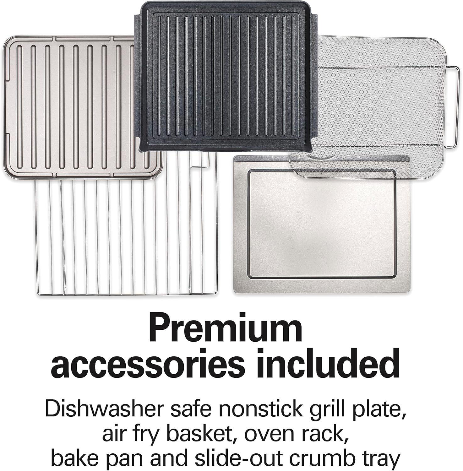PREMIUM ACCESSORIES INCLUDED: The oven comes with all the accessories you need to air fry, grill, bake, broil and toast. These include the dishwasher safe nonstick grill plate, an air fry basket, oven rack, bake pan and slide-out crumb tray.