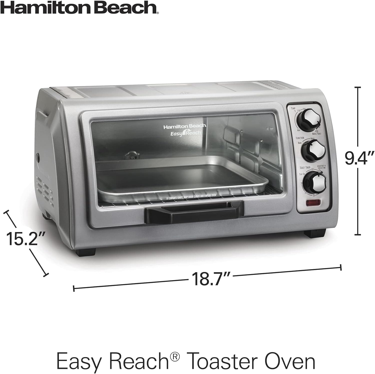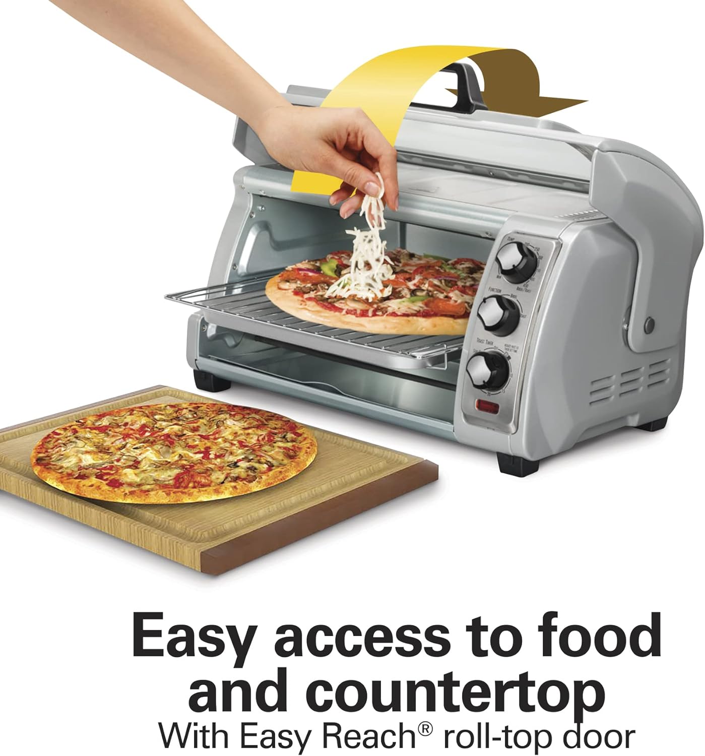 You won’t find a design Like the Hamilton Beach 6 slice easy reach toaster oven with Roll-Top Door anywhere else. Its unique and large opening make food easy to reach. And since the door opens above the oven, It frees up your countertop space in front. Best of all, it’s easy to keep clean Because food can’t spill on the door.