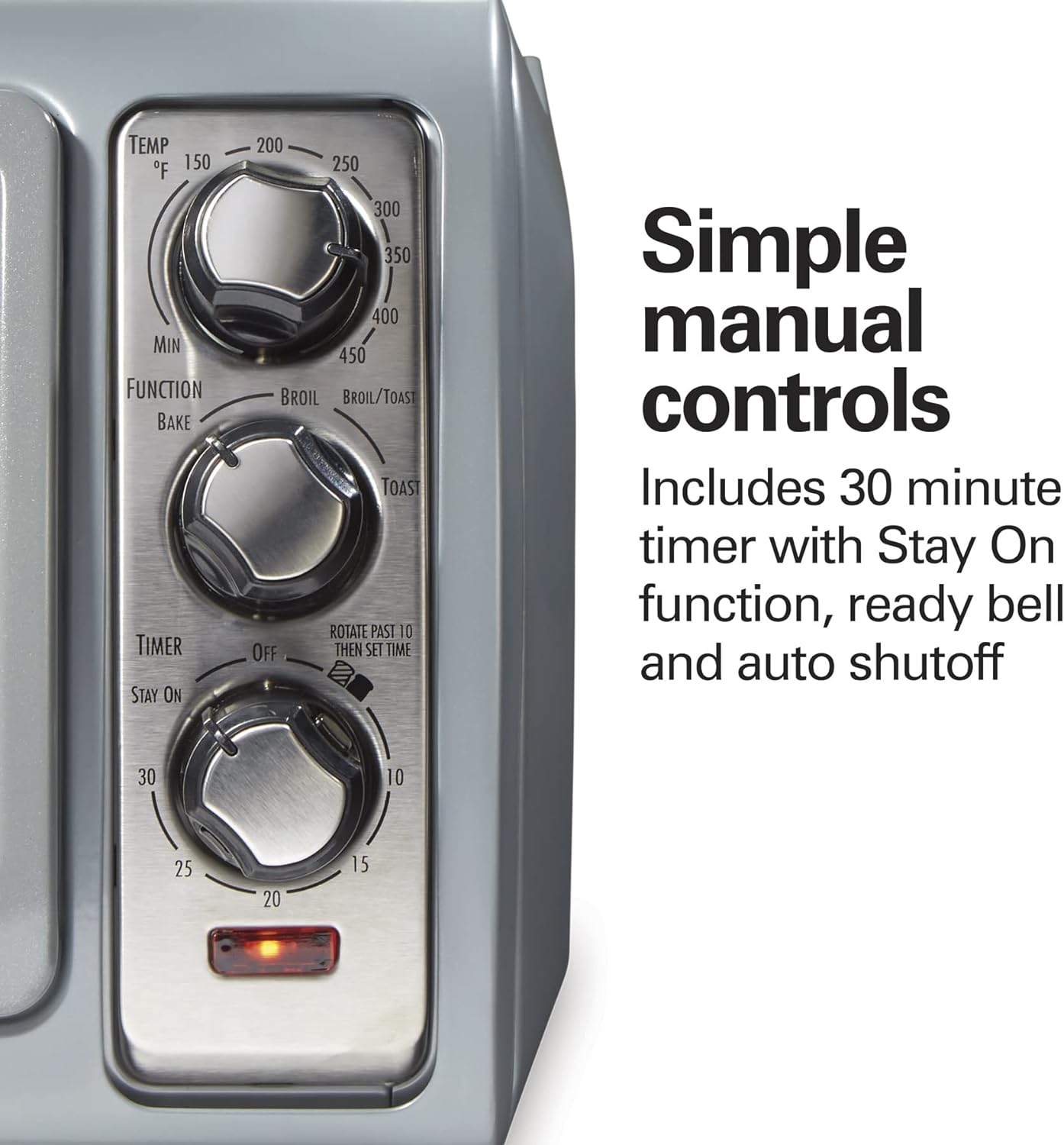 SIMPLE MANUAL CONTROLS: This toaster oven has manual controls that are easy to use. Great for anyone who wants a toaster oven that gets the job done without being complicated. Includes 30 minute timer with Stay On function, ready bell and auto shutoff.