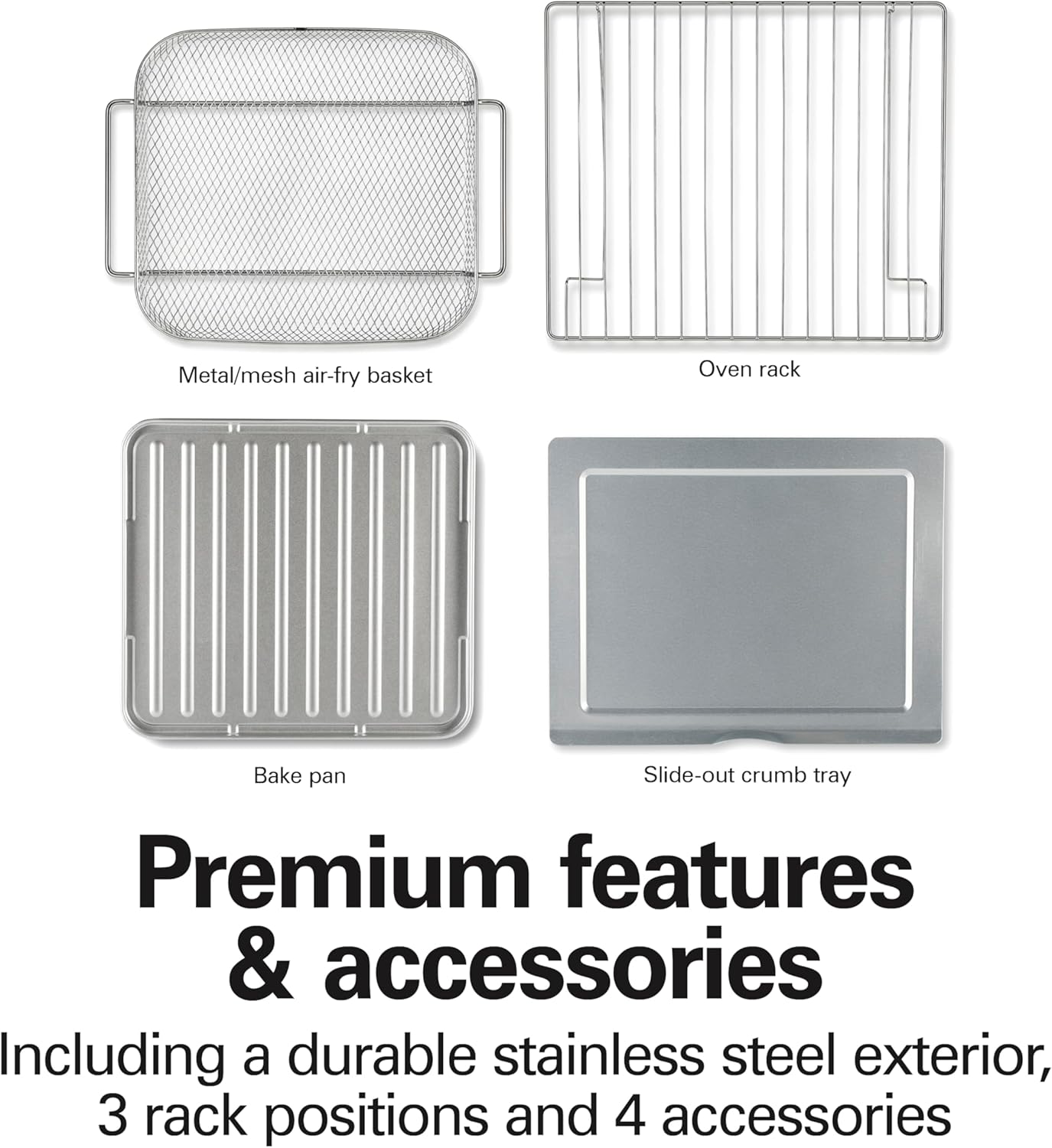 PREMIUM FEATURES AND ACCESSORIES: The air fryer oven combo has a durable stainless steel exterior, 3 rack positions and comes with a mesh air-fry basket, bake pan, oven rack and slide-out crumb tray.