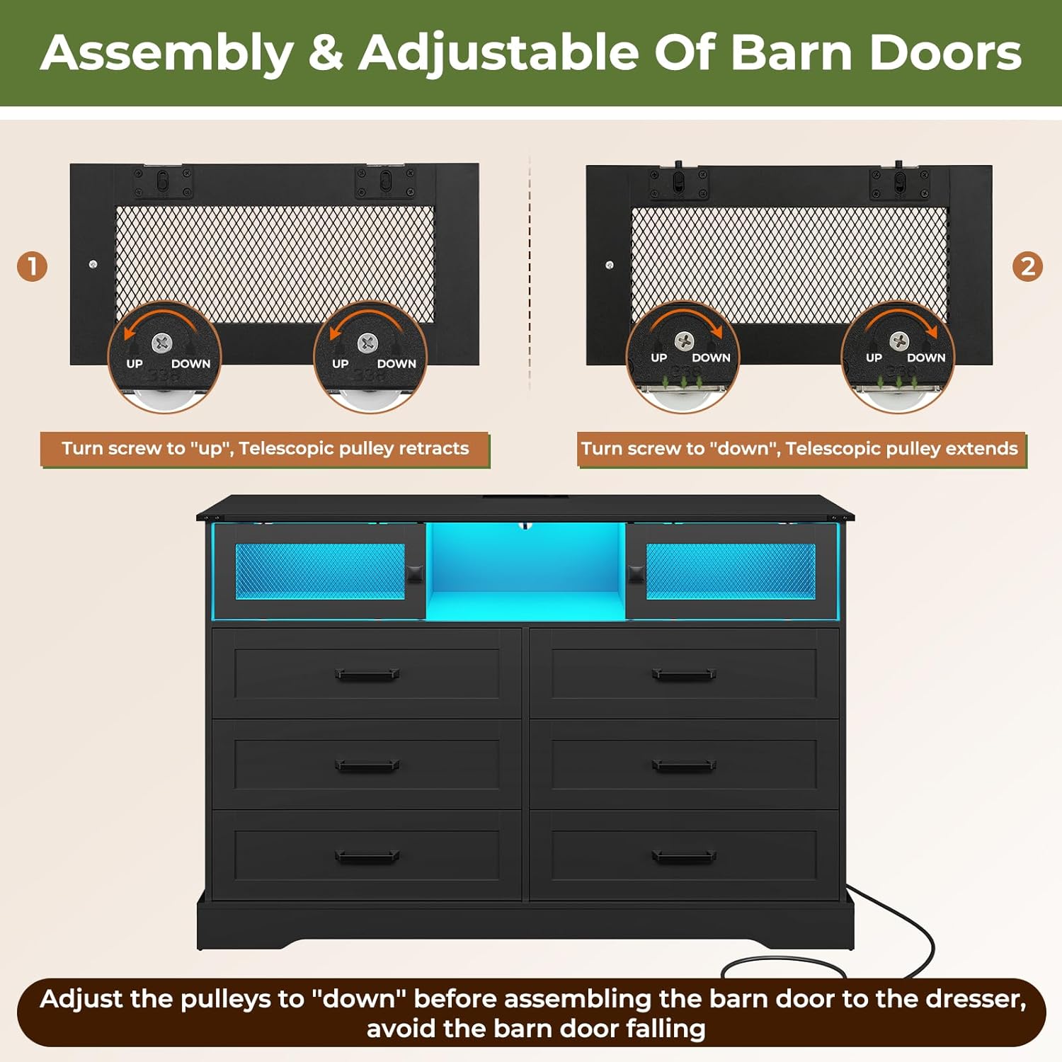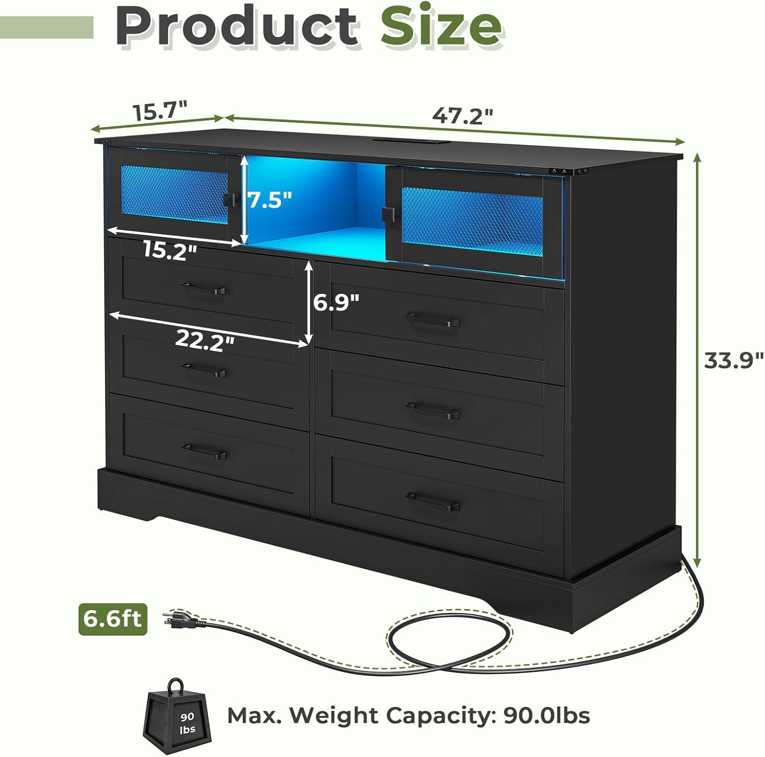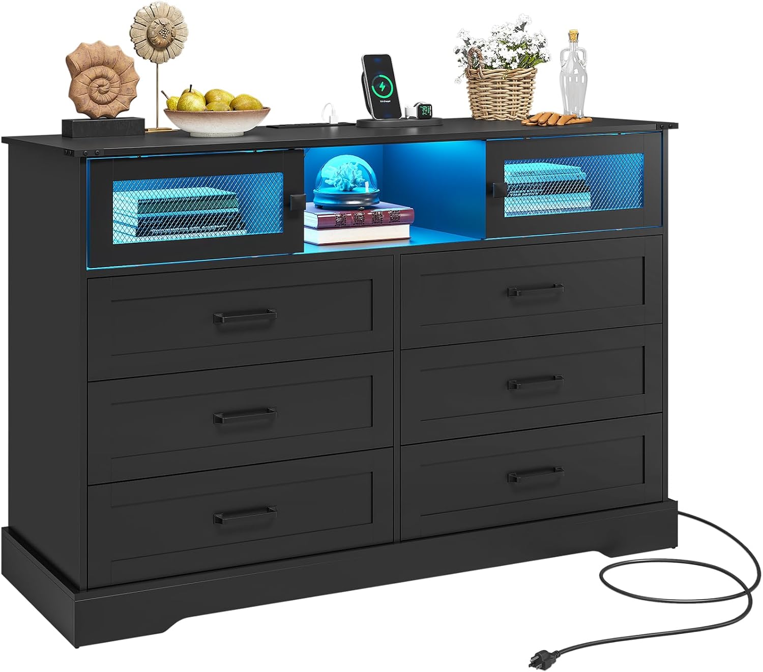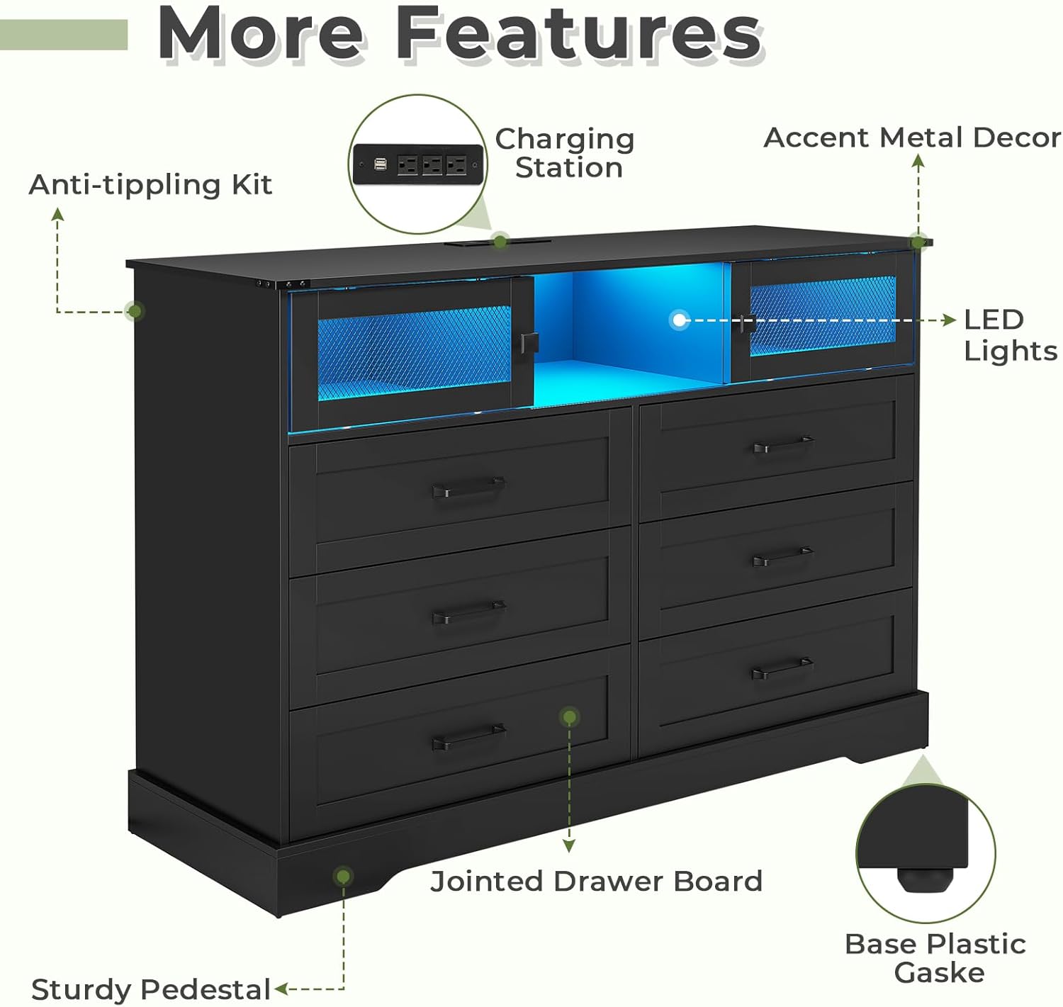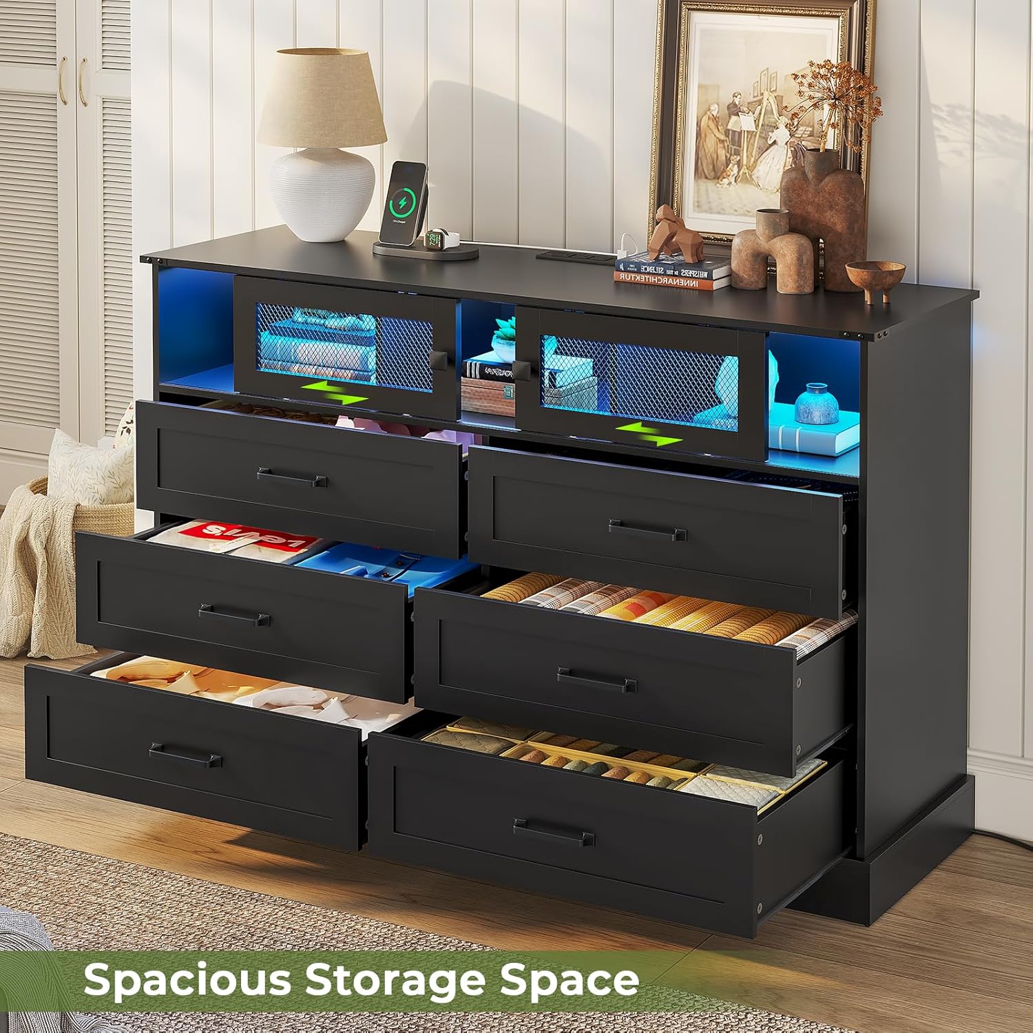 【Multiple Modes Smart LED Lights】 The 6 drawer dresser for bedroom is equipped with hidden light strips in the open cubby. The LED light with a variety of colors and light patterns to choose from. You can also adjust the light change by APP or key control, In addition to directly adjusting the light in the APP, you can also set the music, voice, and timing modes, to discover more wonderfully!