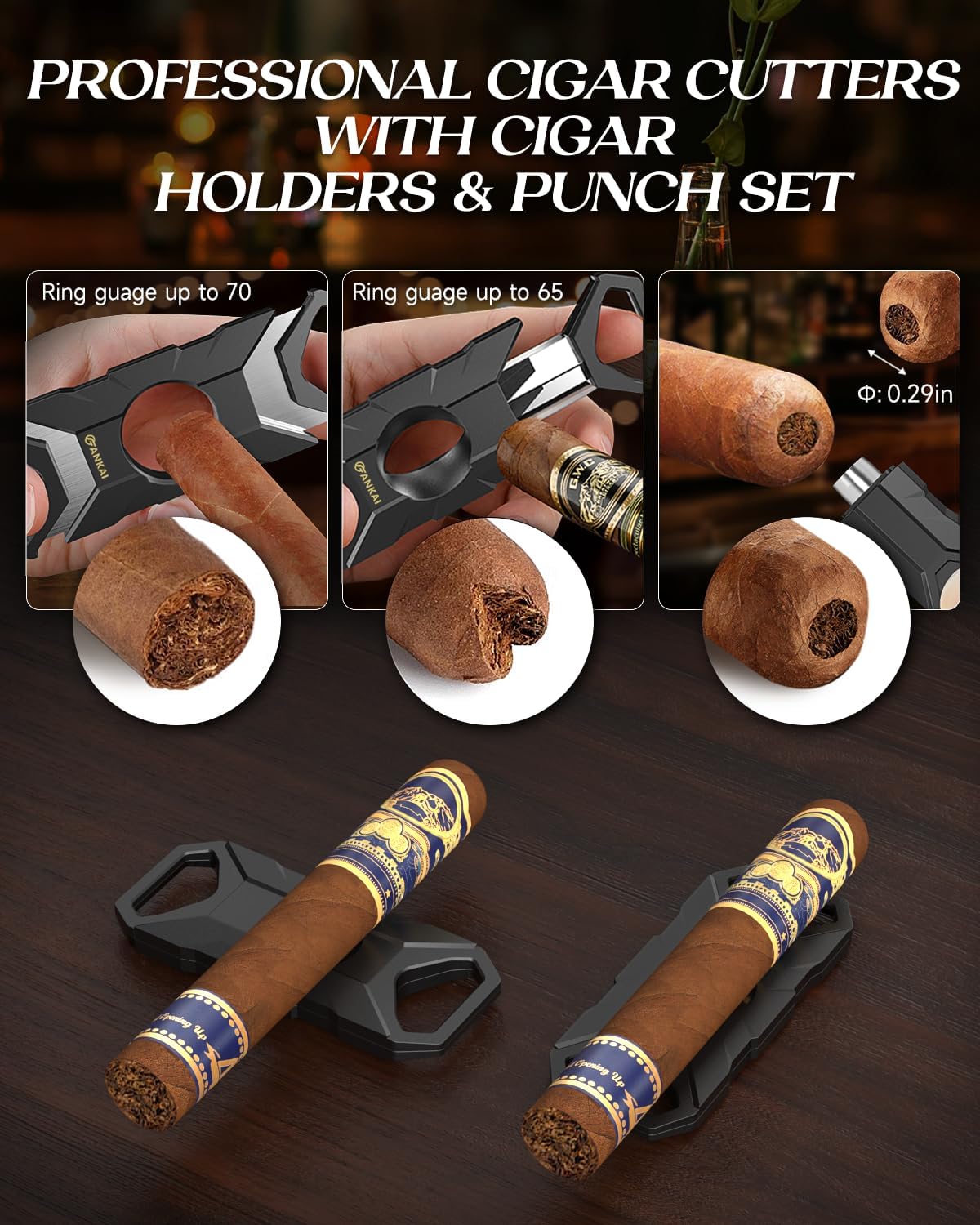 [Cigar Humidor with Cutters & Punch Set]- New Transparent Edition: Featuring the same crystal-clear glass top for climate-safe cigar visibility, now in a sophisticated finish; Includes our signature 3-cutters toolkit (Guillotine + V-Cutter + Punch); Compact 9.05″x6.69″x2.75″ frame at 1.77 lbs elegantly complements modern deskscapes
