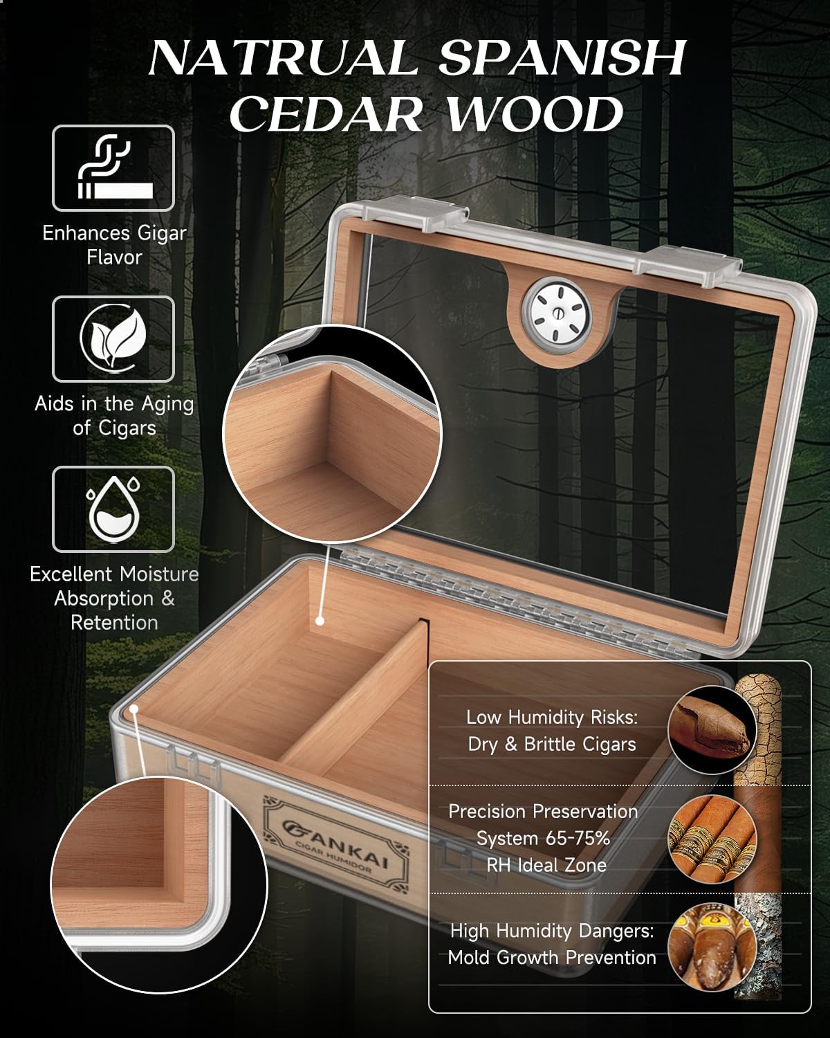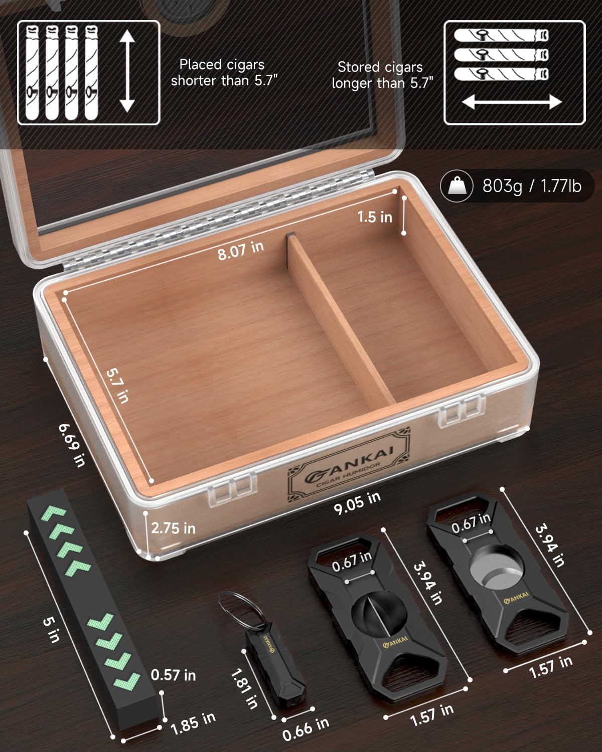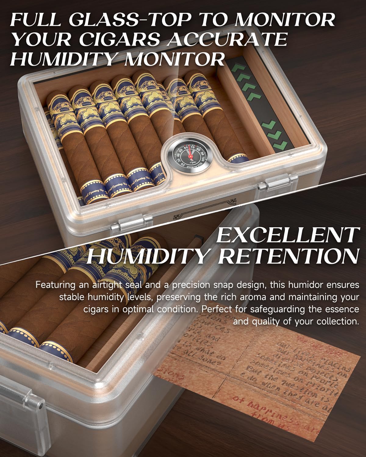 [Ideal Gift for Cigar lovers]-Transperant Edition Advantage: This humidor cigar box variant delivers identical functionality—5-piece toolkit (humidifier, dropper, straight/V cutters, punch) and hygrometer for real-time ambient monitoring; Customizable dividers organize 20-25 cigars, while portable dimensions make it the ultimate travel partner for cigar connoisseurs
