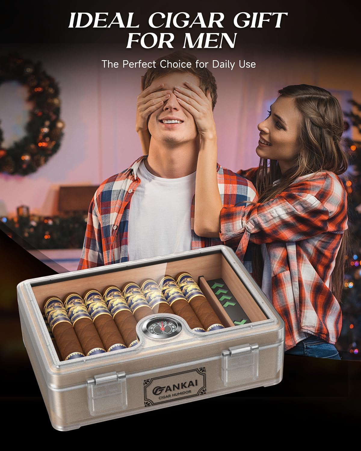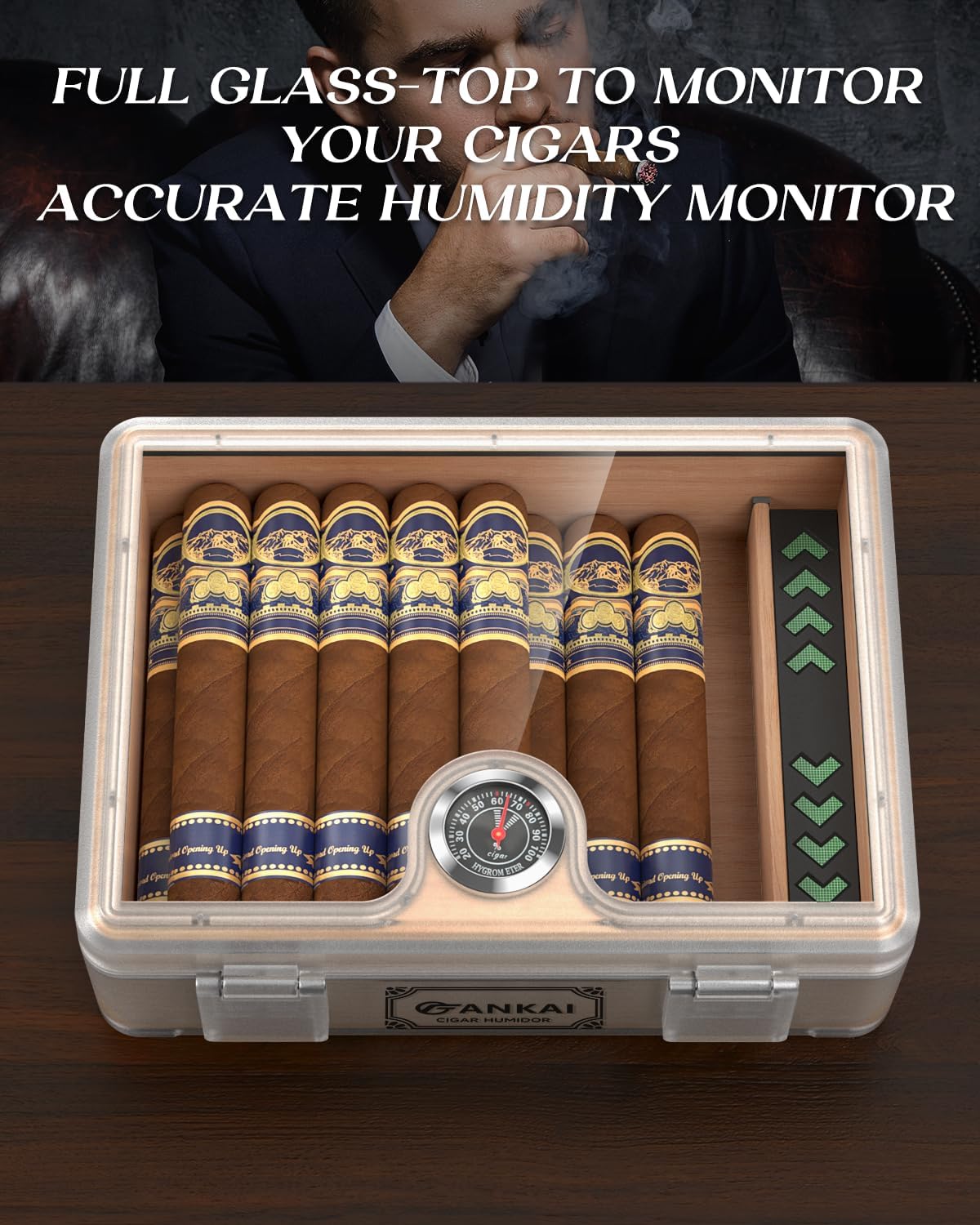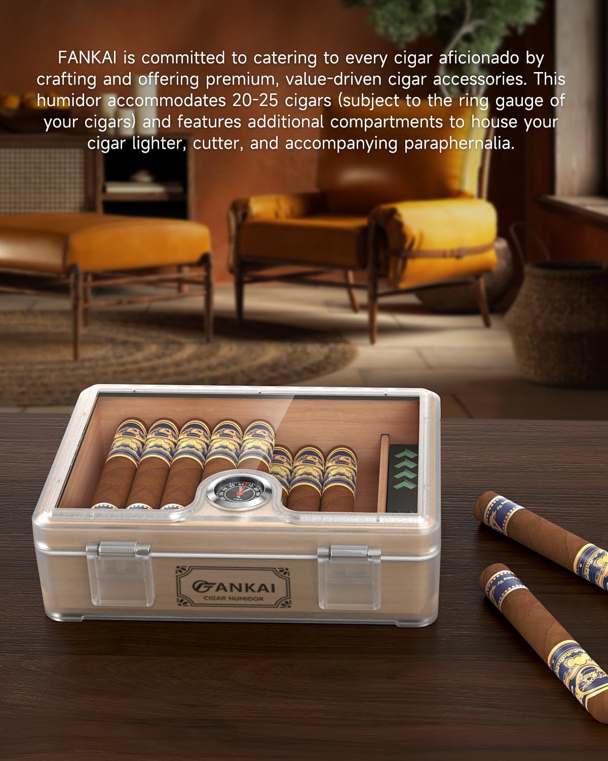 [Ideal Gift for Cigar lovers]-Transperant Edition Advantage: This humidor cigar box variant delivers identical functionality—5-piece toolkit (humidifier, dropper, straight/V cutters, punch) and hygrometer for real-time ambient monitoring; Customizable dividers organize 20-25 cigars, while portable dimensions make it the ultimate travel partner for cigar connoisseurs