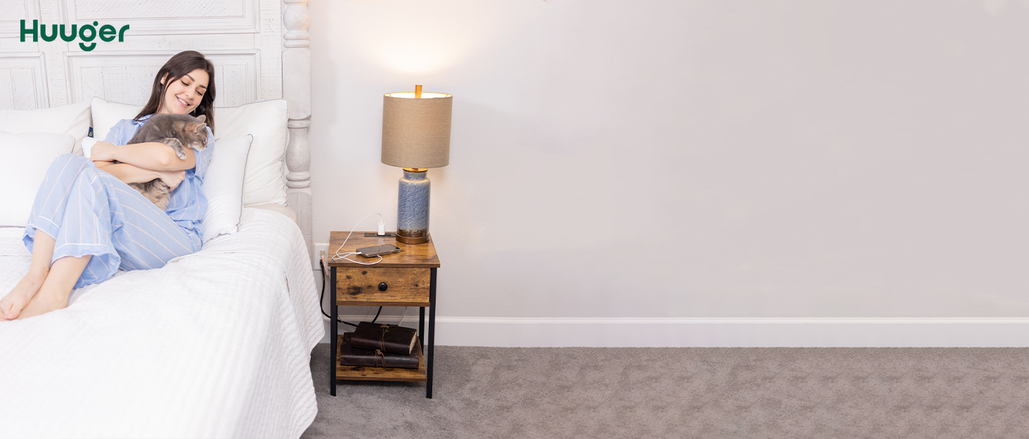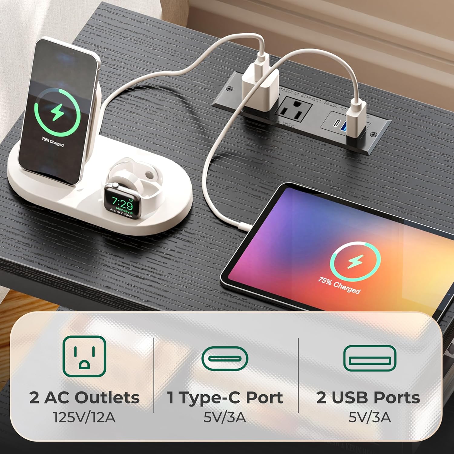 【Nightstand with Charging Station】This modern nightstand is equipped with 2 AC outlets, 1 USB port, and 1 Type-C port, providing ample charging options right at your bedside. Whether you need to plug in your phone, tablet, or other electronic devices, this black night stand ensures you wake up to fully charged gadgets every morning. Huuger
