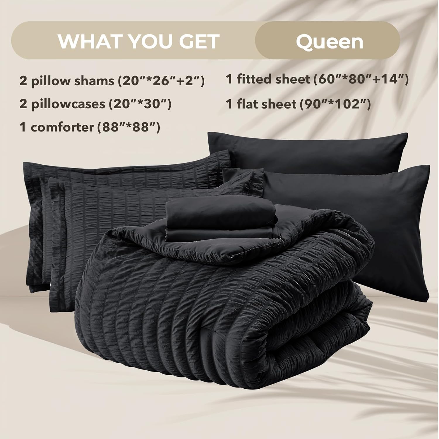 What’s Included: The queen size bed set includes 1 Comforter (88″ x 88″), 2 Pillowcases (20″ x 30″), 2 Pillow Shams (20″ x 26″ + 2″), 1 Fitted Sheet (60″ x 80″ + 14″), and 1 Flat Sheet (90″ x 102″); the set is packed in a vacuum bag; simply dry on low heat or gently fluff under the sun to restore its loft