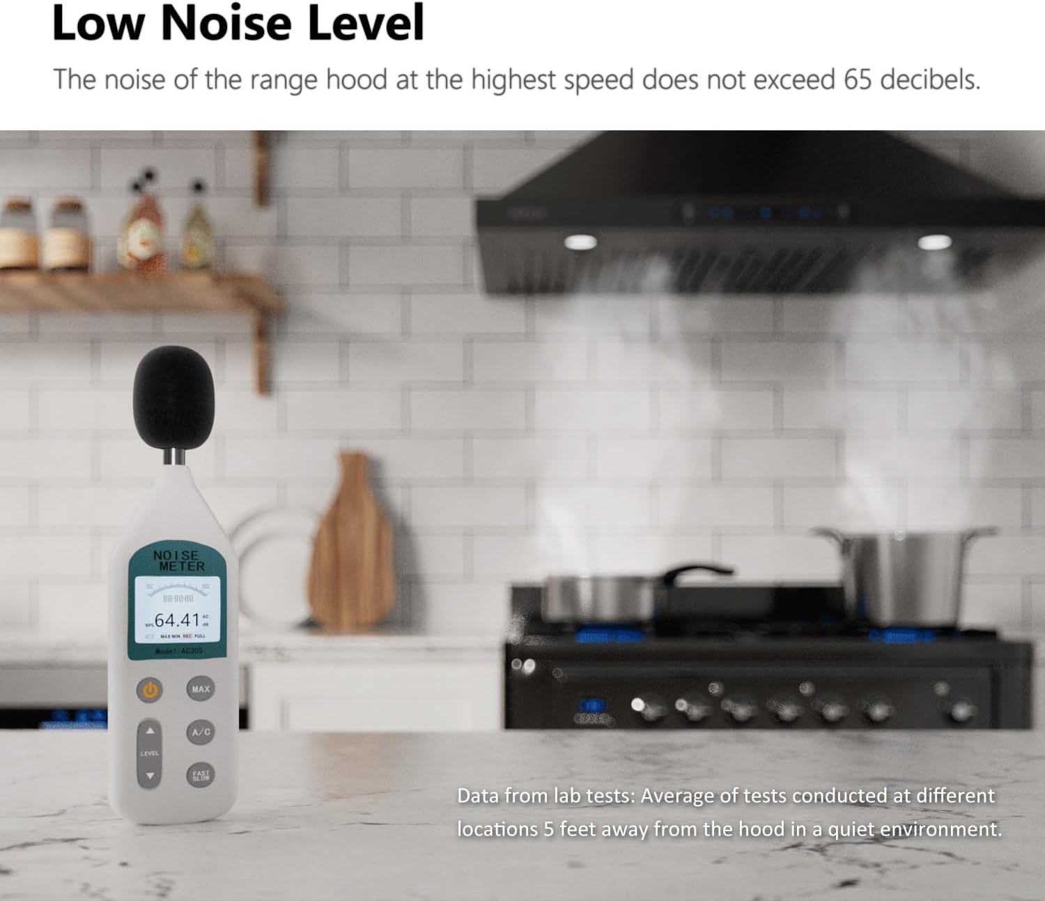【Ultra-Quiet Operation】: Customize your kitchen stove vent with the 4-speed setting to play with the suction and noise level. The noise level is at 40 decibels on the lowest setting and only 65dB max noise level.