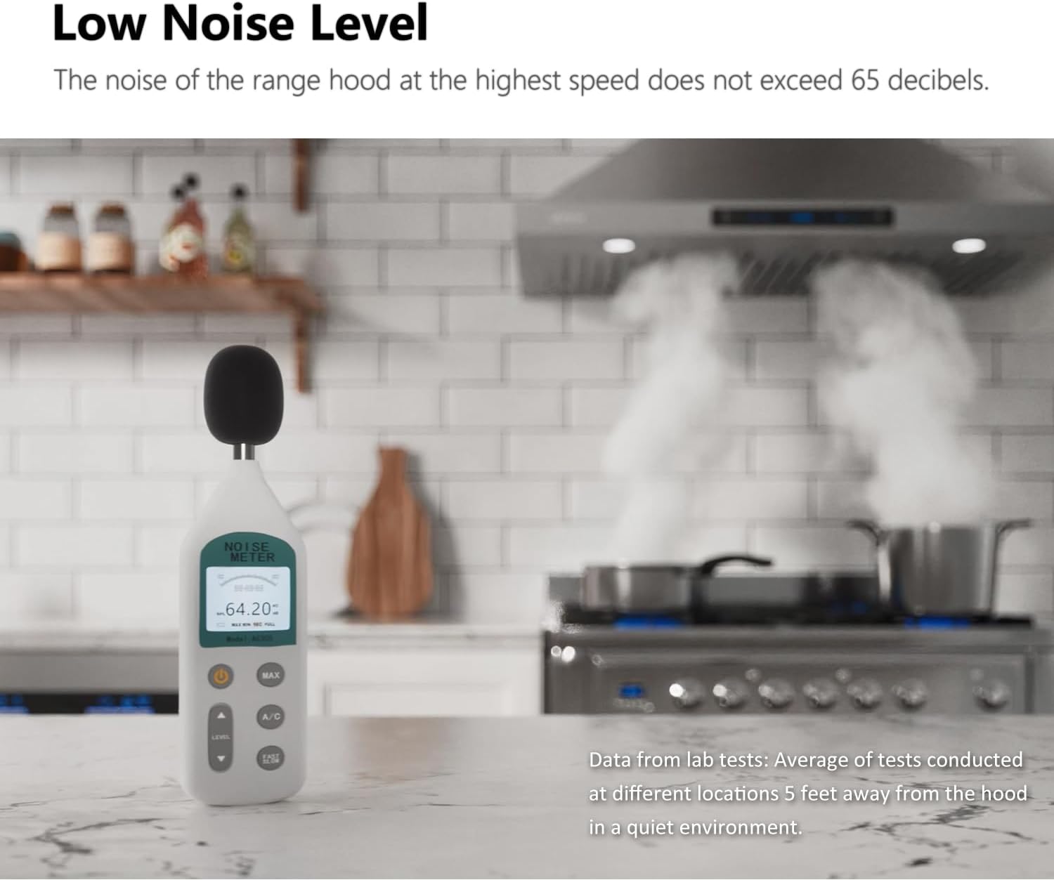 【Ultra-Quiet Operation】: Customize your kitchen stove vent with the 4-speed setting to play with the suction and noise level. The noise level is at 40 decibels on the lowest setting and only 65dB max noise level.
