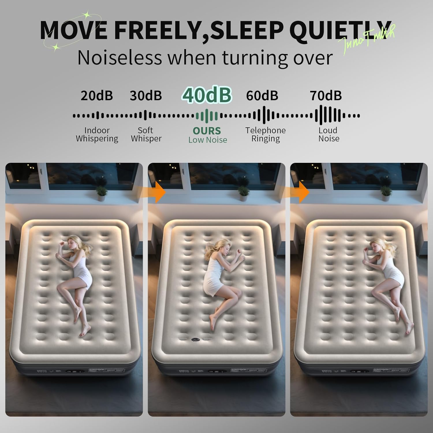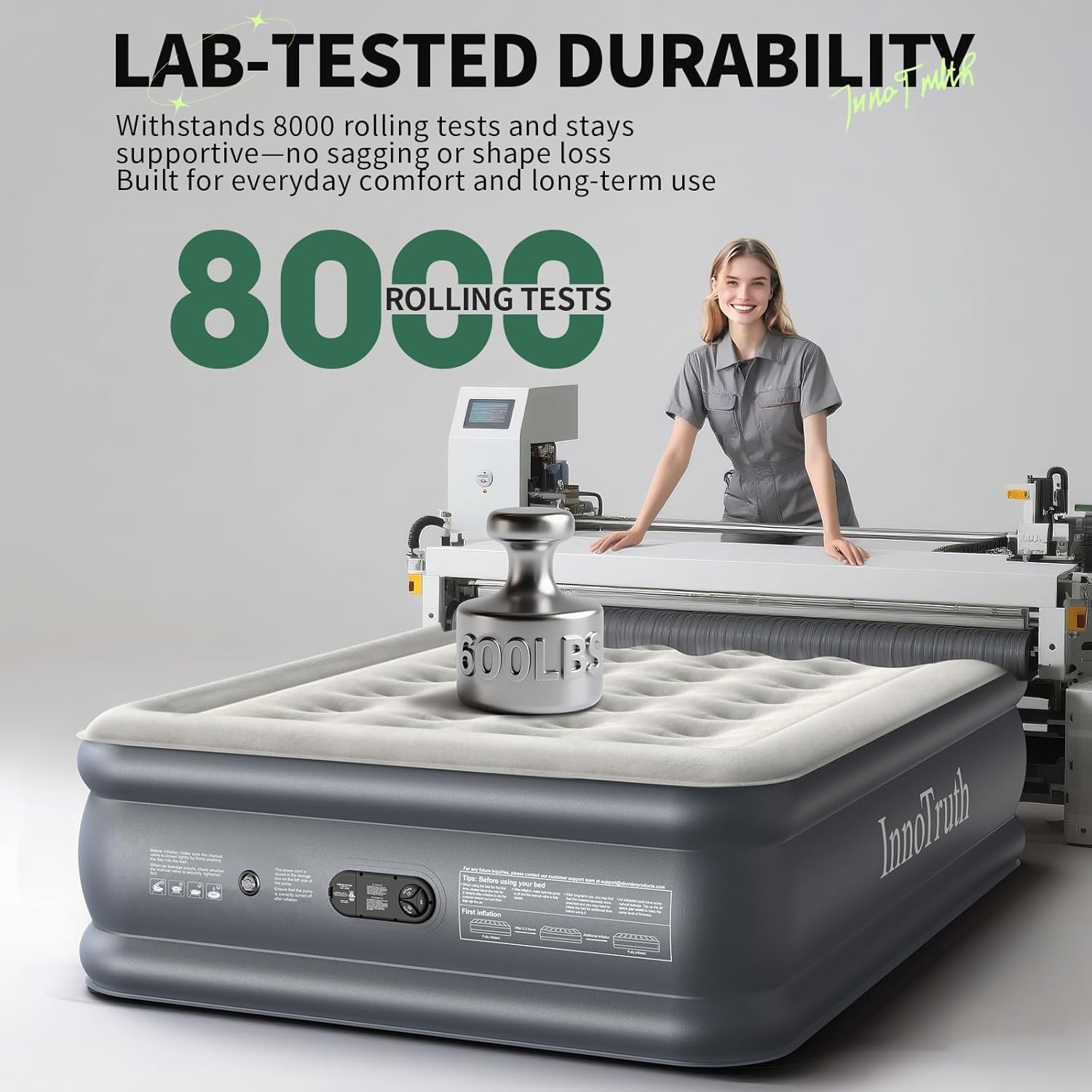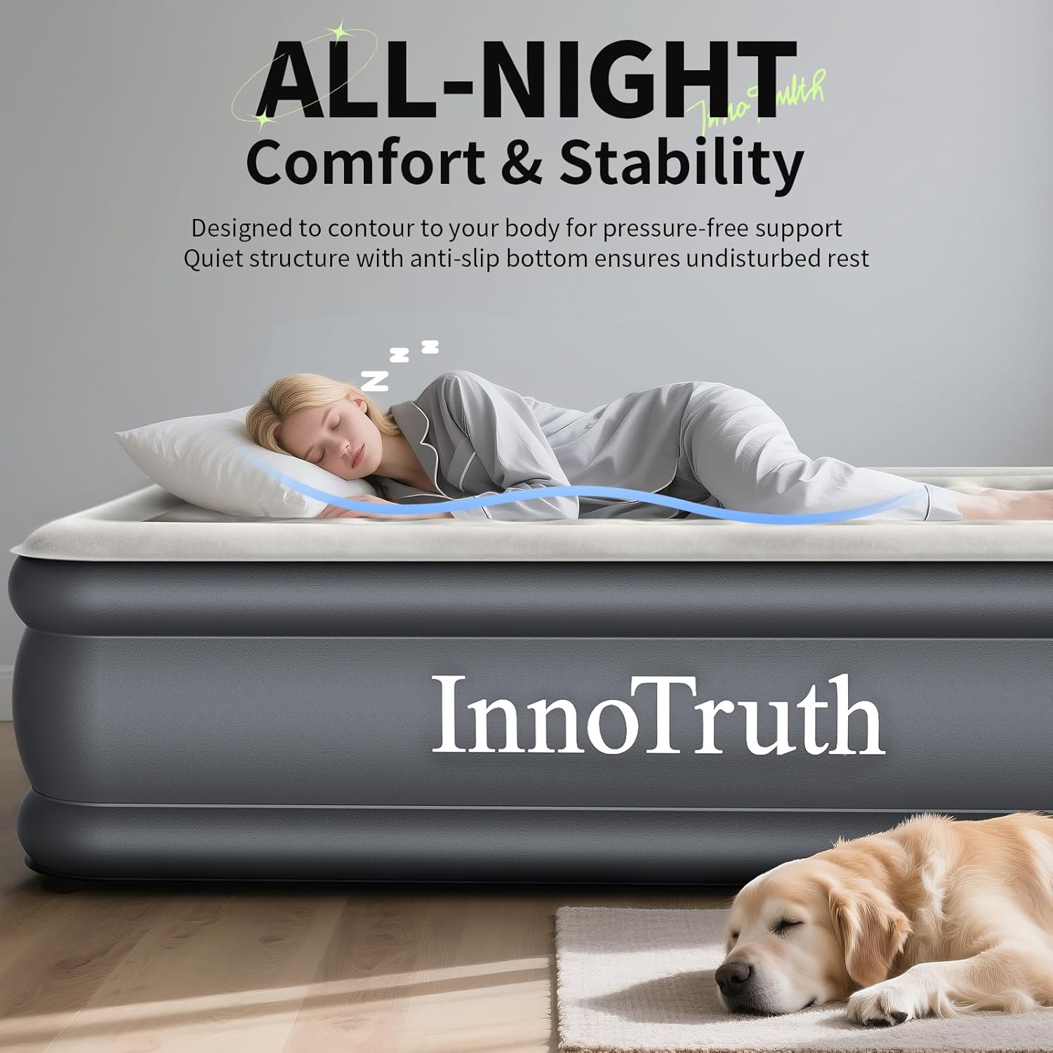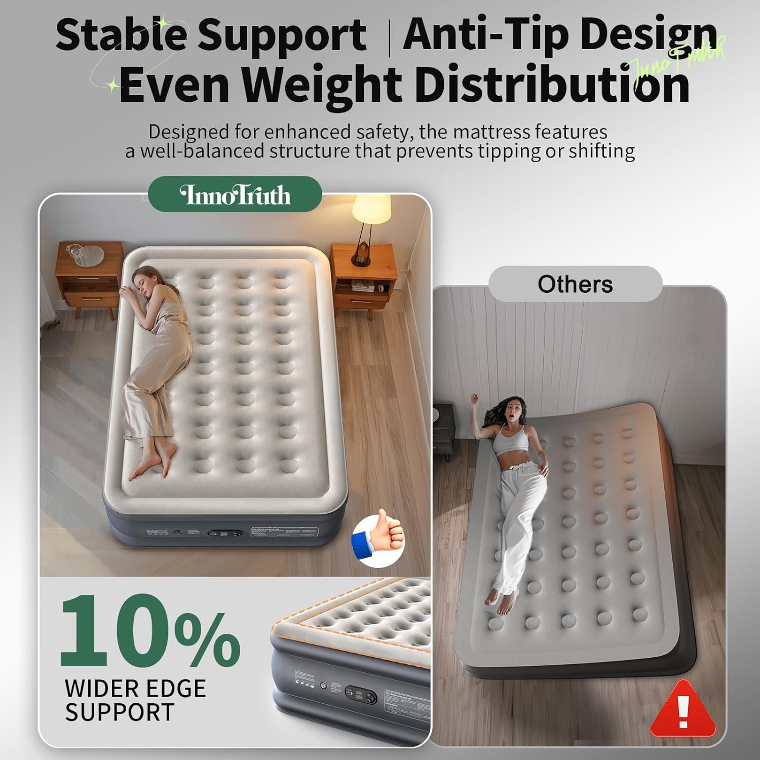 𝐏𝐫𝐞𝐦𝐢𝐮𝐦-𝐆𝐫𝐚𝐝𝐞 𝐌𝐚𝐭𝐞𝐫𝐢𝐚𝐥𝐬: Made with 10% thicker, upgraded PVC, the InnoTruth airbed provides enhanced durability and reliable support. Its reinforced surface resists daily wear and tear, while the quiet, non-slip base keeps the mattress securely in place throughout the night