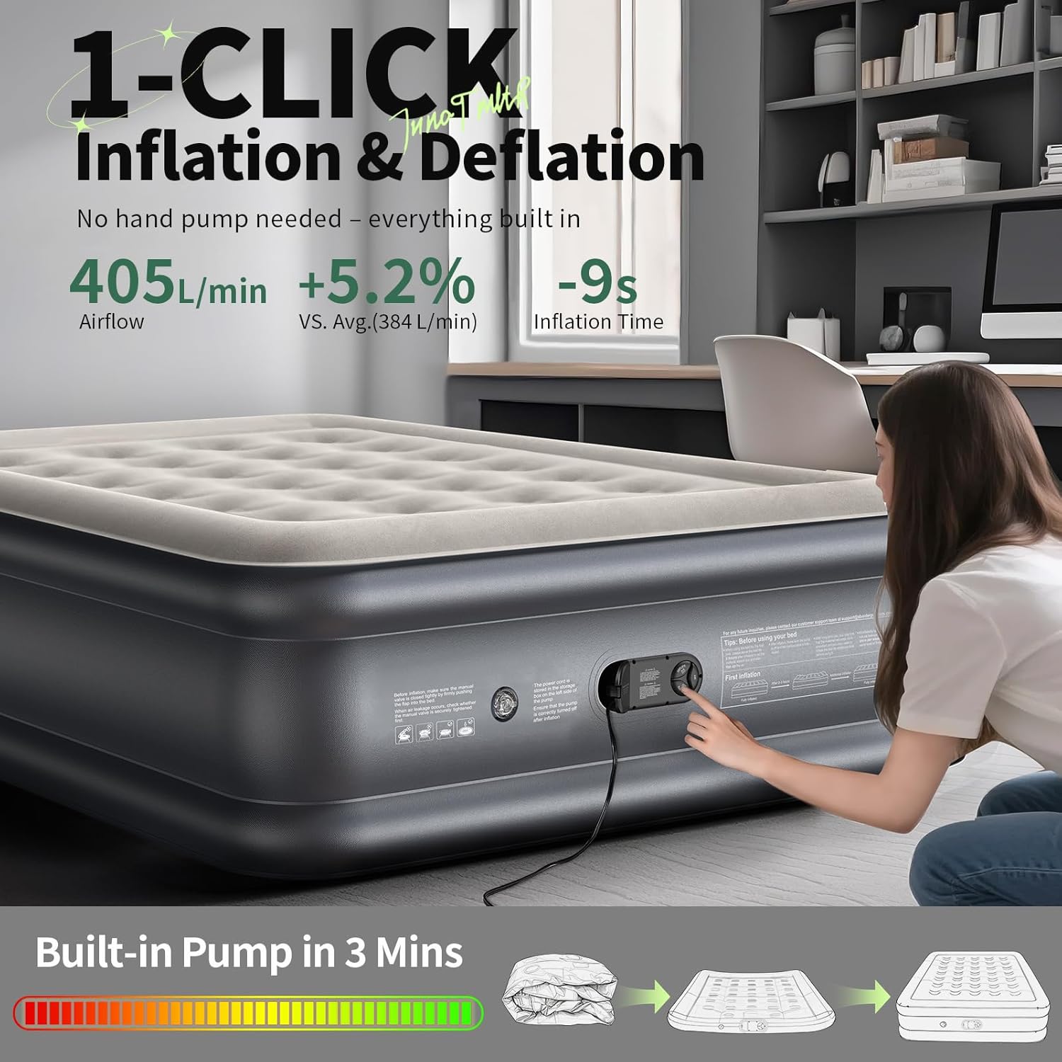 𝐔𝐧𝐫𝐢𝐯𝐚𝐥𝐞𝐝 𝐂𝐨𝐦𝐟𝐨𝐫𝐭: Enjoy quick, firm support with the InnoTruth air mattress, featuring a powerful 110V pump that inflates or deflates in just 3 minutes. The Smart Air Coil System conforms to your body’s natural curves, evenly distrubuting weight to minimize sinking and relieve pressure on your back