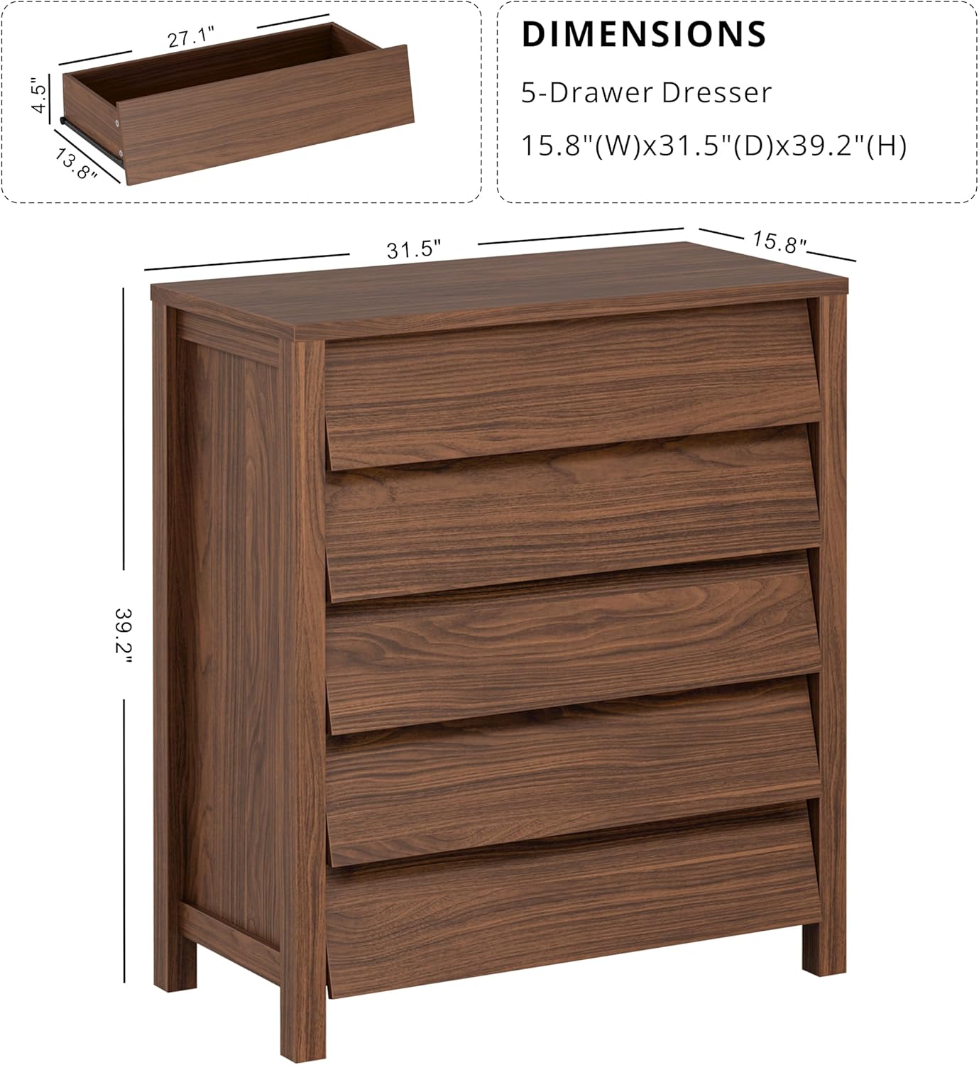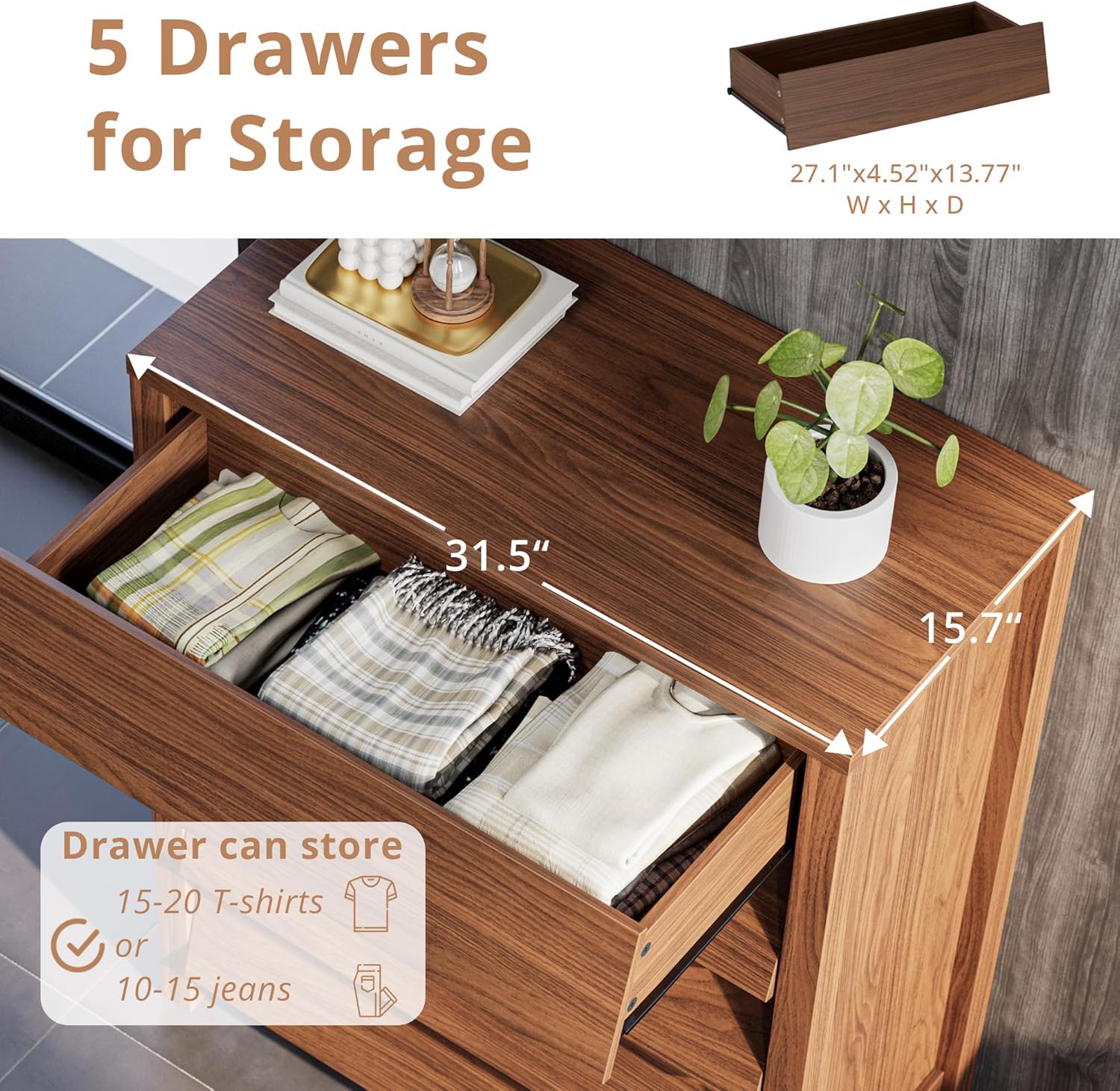 Elegant Walnut Dresser: At 31.5″W x15.7″ D, this narrow dresser fits snugly in apartments, dorms, or tight bedrooms. A rich walnut finish adds luxury to minimalist. Perfect as an Entryway Table, Bedroom Dresser, or Living Room Storage