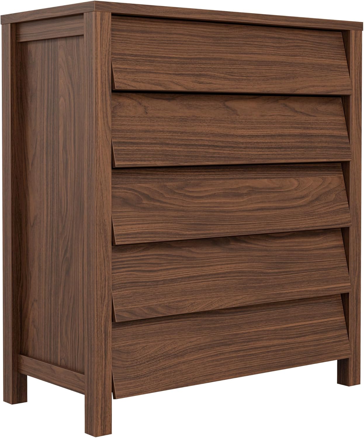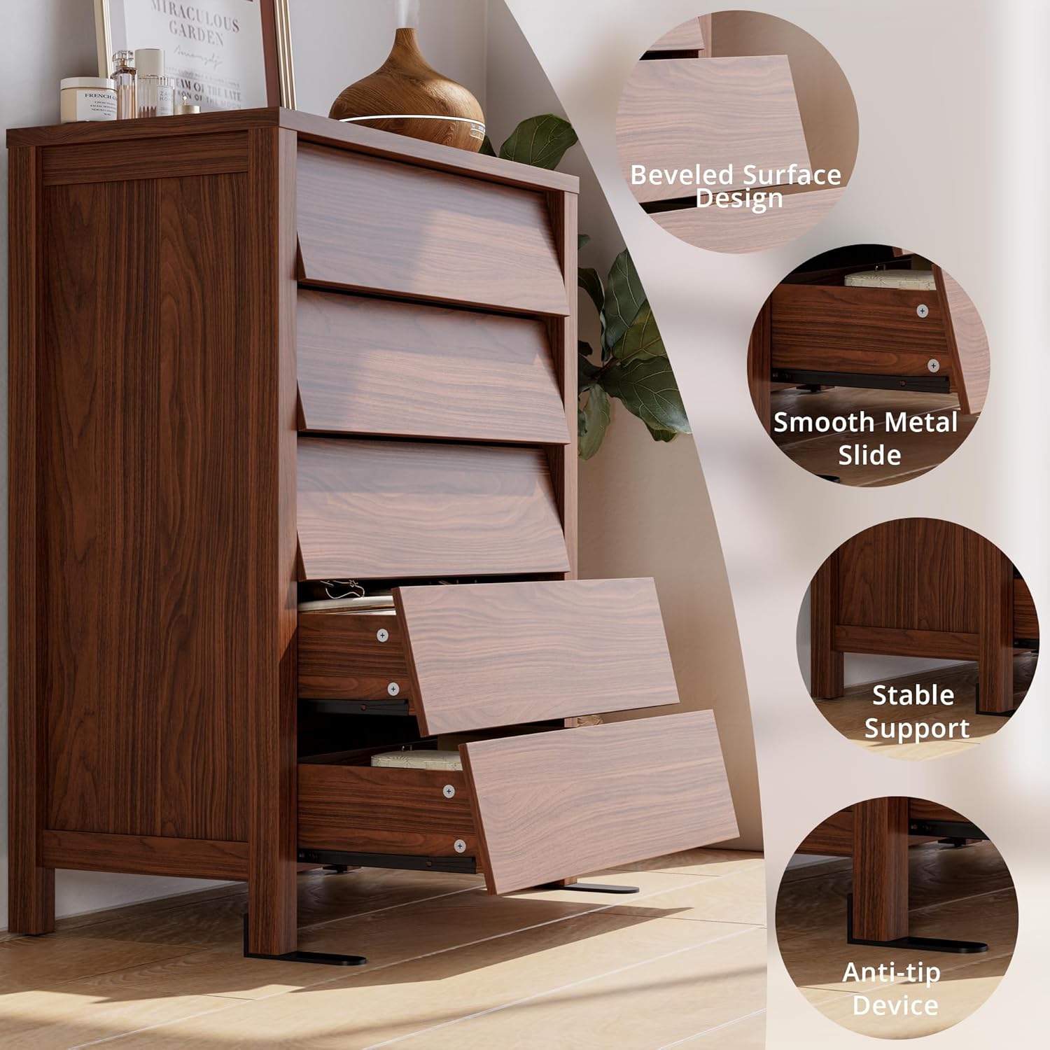 Beveled Handleless Design: This modern chest of drawers eliminates protruding handles with a smooth, beveled-edge opening system. The eco-friendly, scratch-resistant surface ensures a clutter-free look while reducing injury risks for families with kids or pets