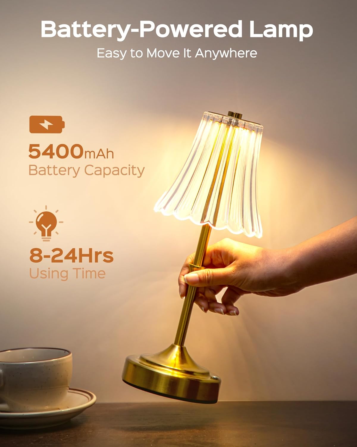 5400MAH LARGE BATTERY: The battery powered lamp is built-in with 5400mAh rechargeable battery, powering 2 nights of illumination at low brightness on a full charge. With the included USB-C cable, this cordless rechargeable lamp is your perfect bedtime reading companion