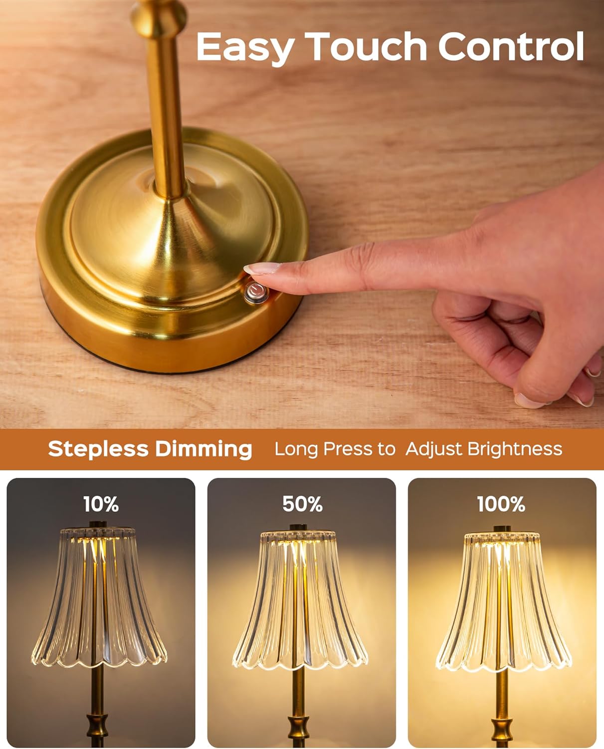 EASY TOUCH CONTROL: Tap to adjust the vintage lamp’s light color, and hold to adjust its brightness to your liking. Whether you prefer a soft bedside glow or vibrant living room decor, this wireless lamp adapts perfectly to your needs