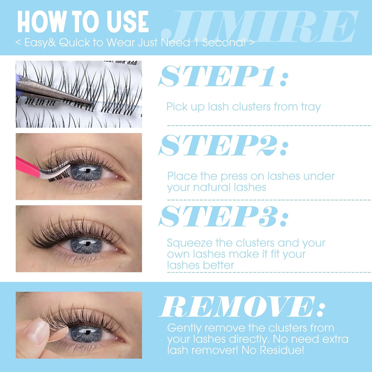 Reusable& Valuable: JIMIRE wispy pre-glued eyelash clusters can be reused with adhesive strips and also can be used with lash bond seal or other lash glue, they can be reused up to 5 times with a proper care. Eco-friendly and valuable