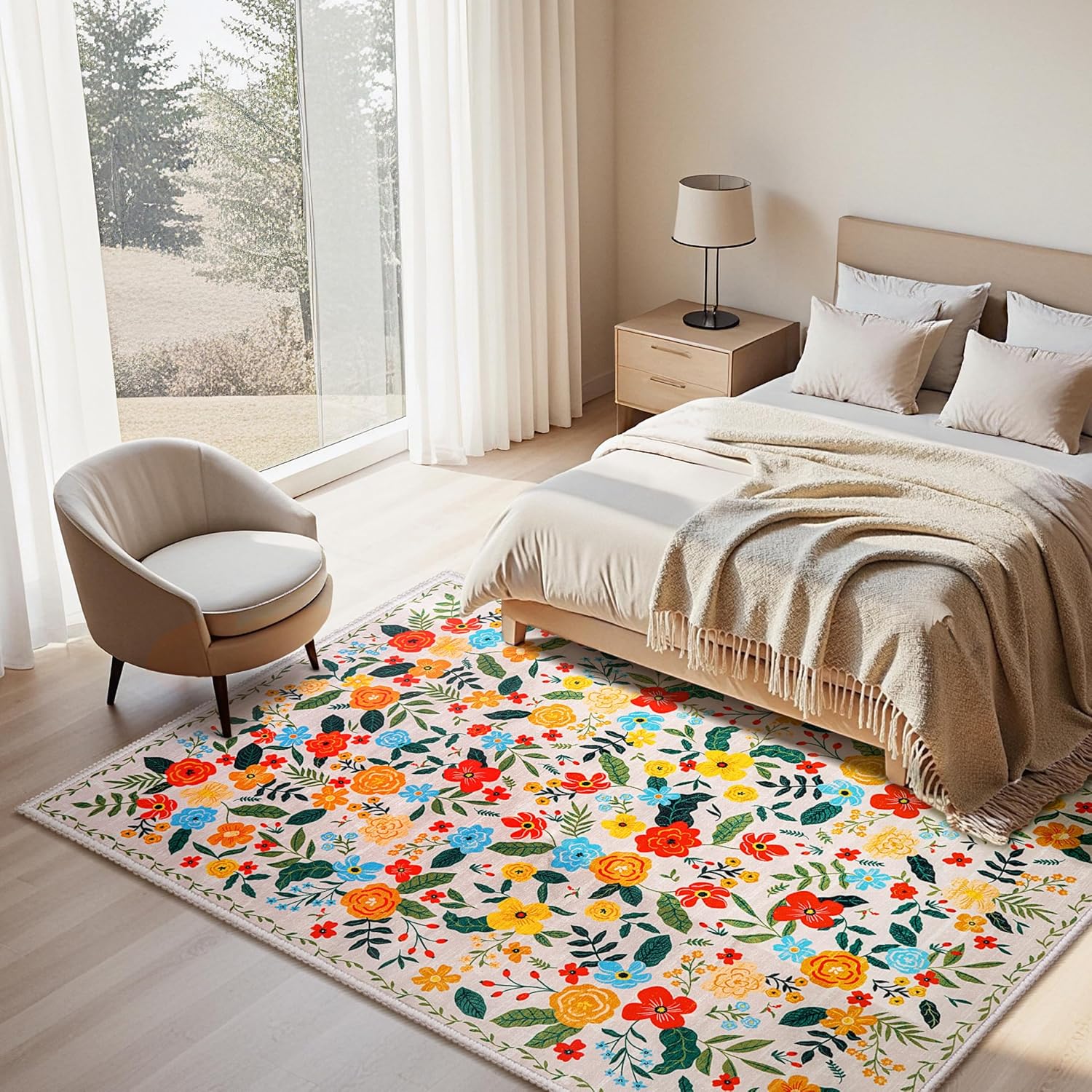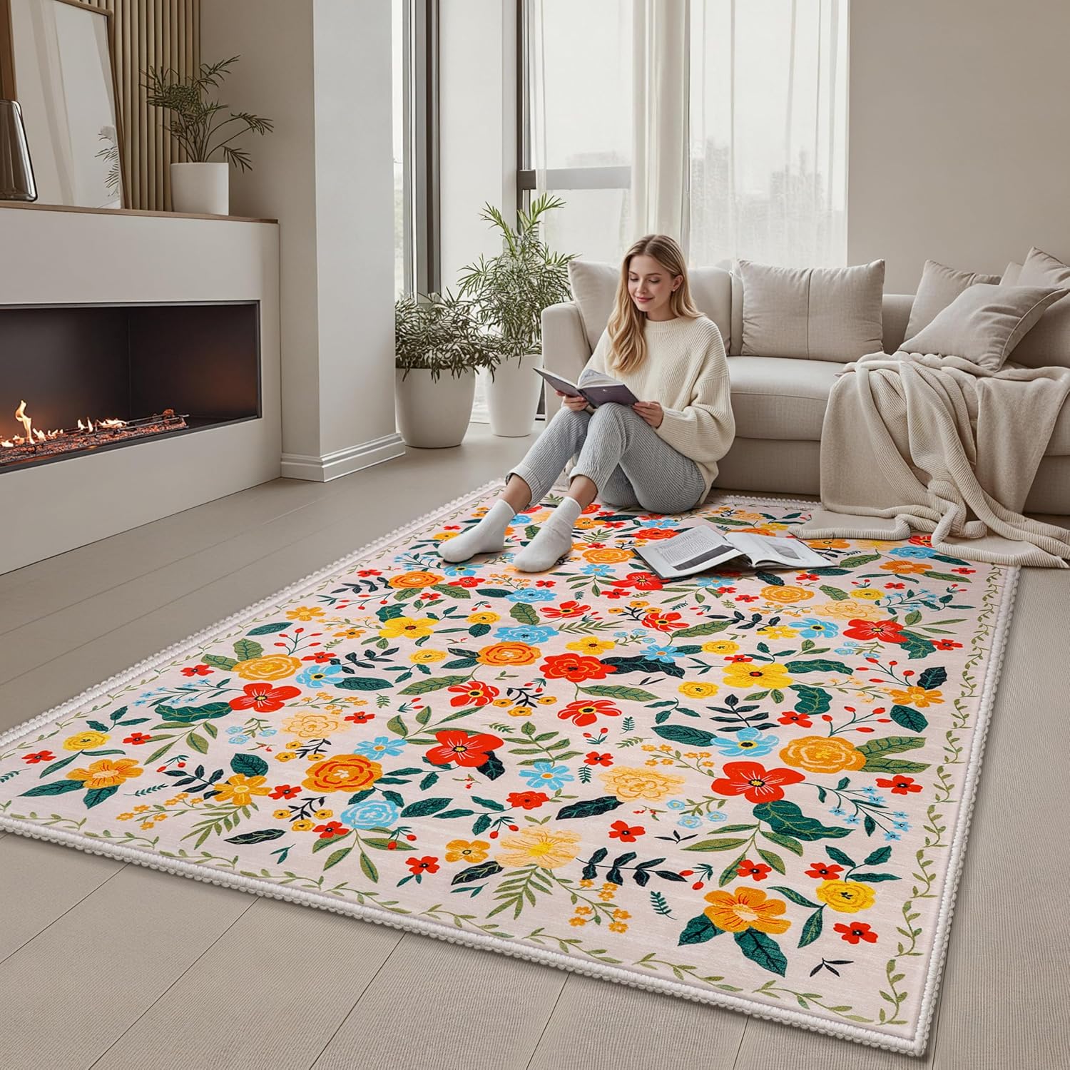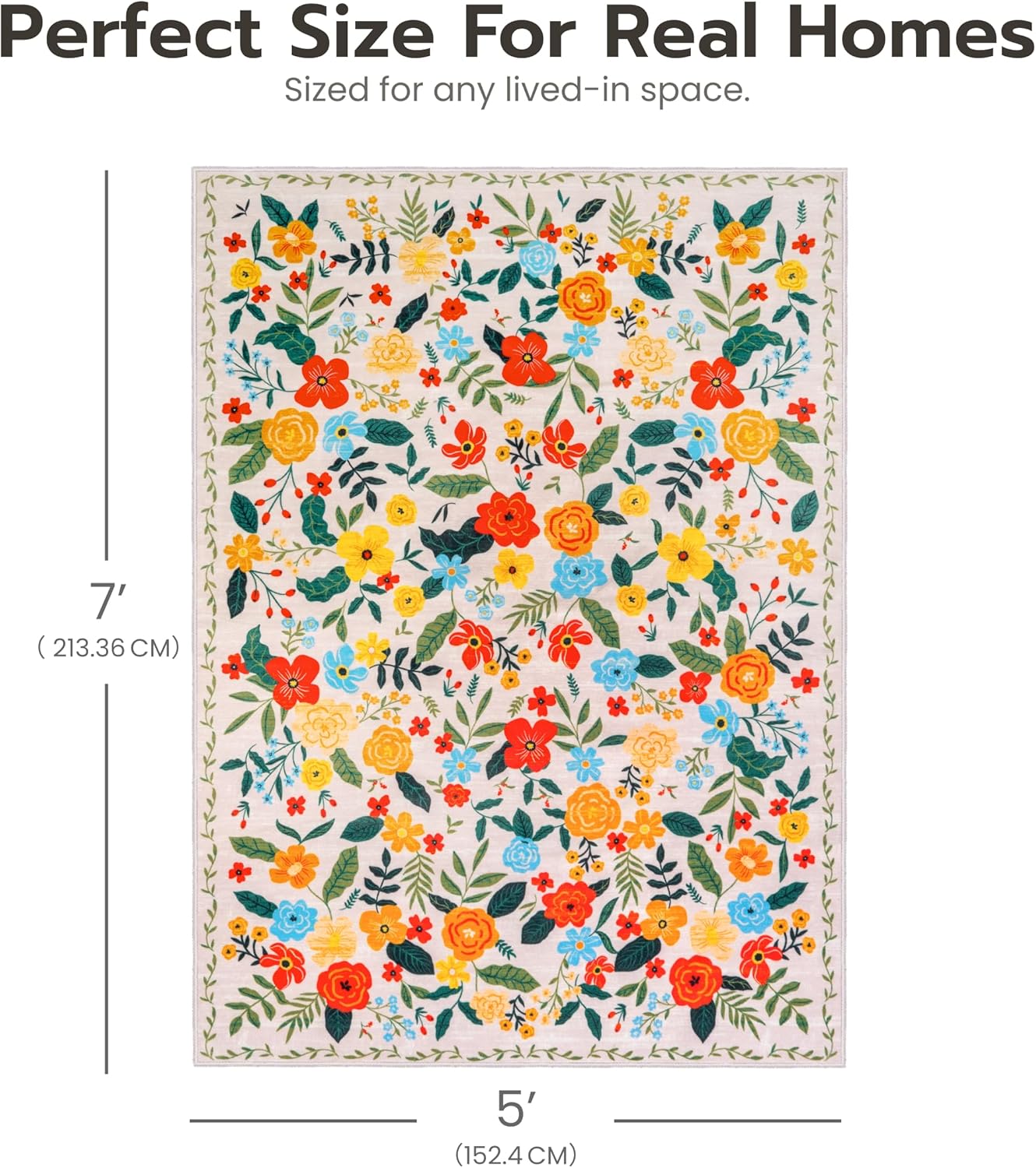 Joiedomi 5’x7′ Area Rugs for Living Room Non-Slip Washable Rug with Rubber Backing Large Soft Boho Floral Carpet for Bedroom Kids Nursery Dining Room (Beige)