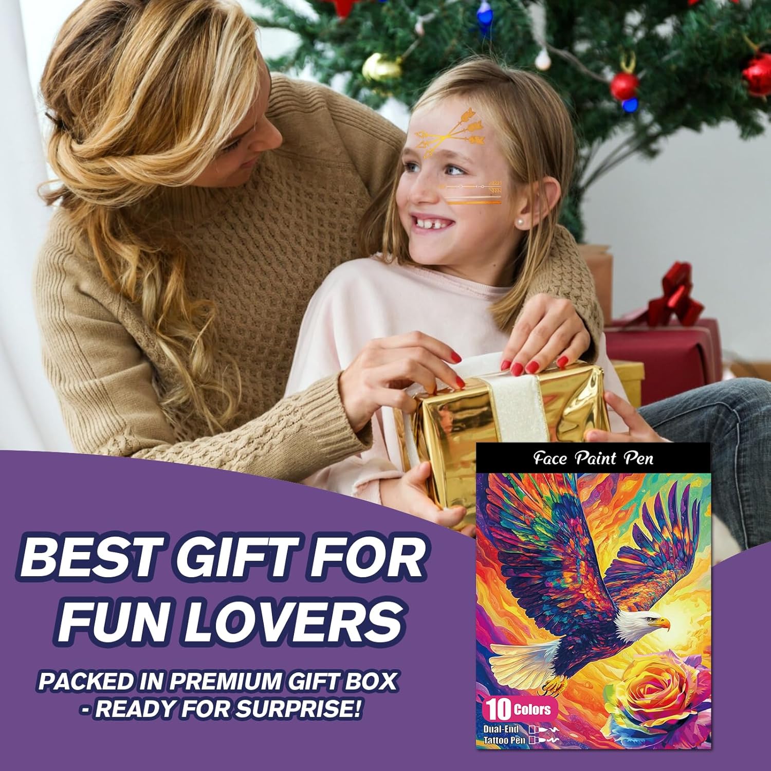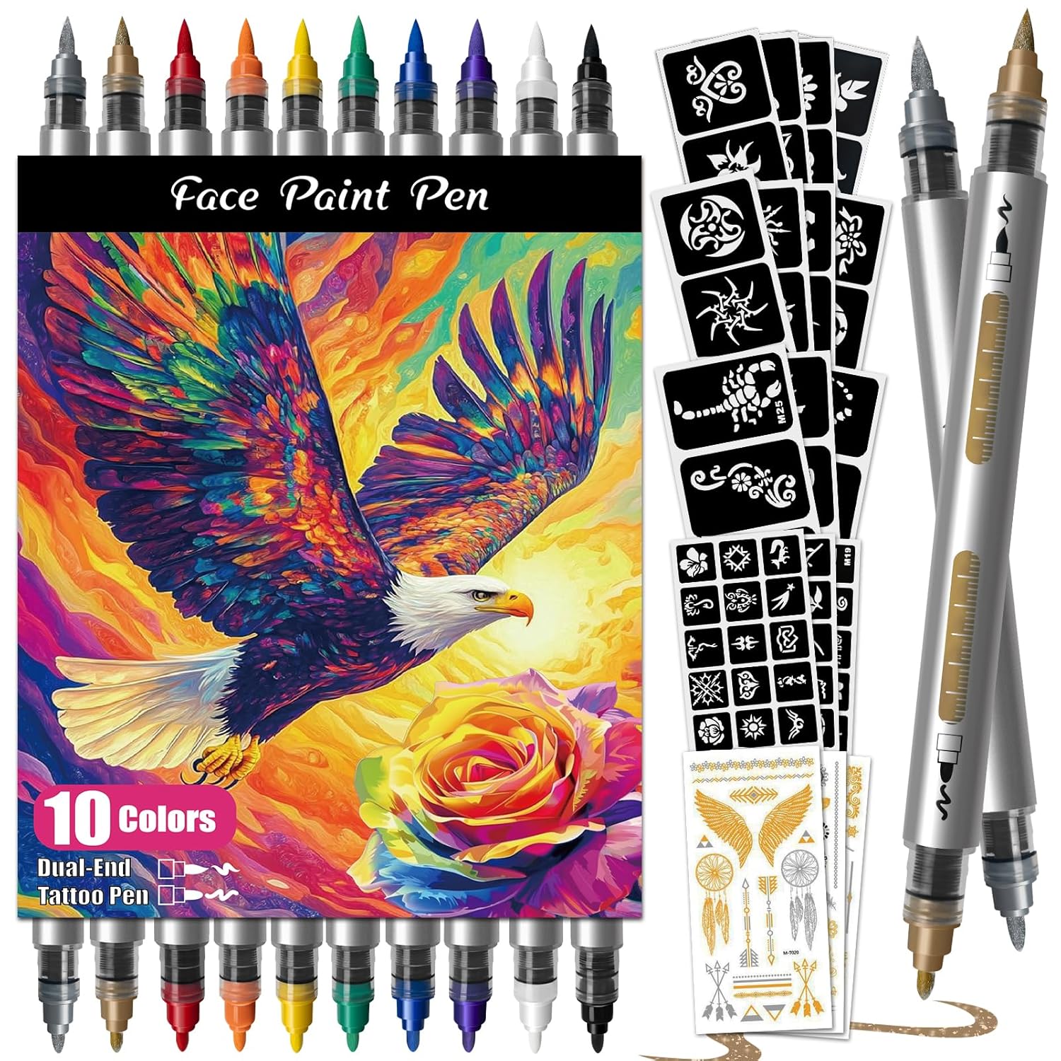 10 VIBRANT COLORS WITH METALLIC ACCENTS – Unleash stunning artistry with 10 carefully curated colors! This complete set includes 8 classic vibrant markers and 2 premium metallic inks (gold and silver) for dazzling shine. Create eye-catching designs that blend bold colors with brilliant shimmer effects for truly unique temporary tattoos.
