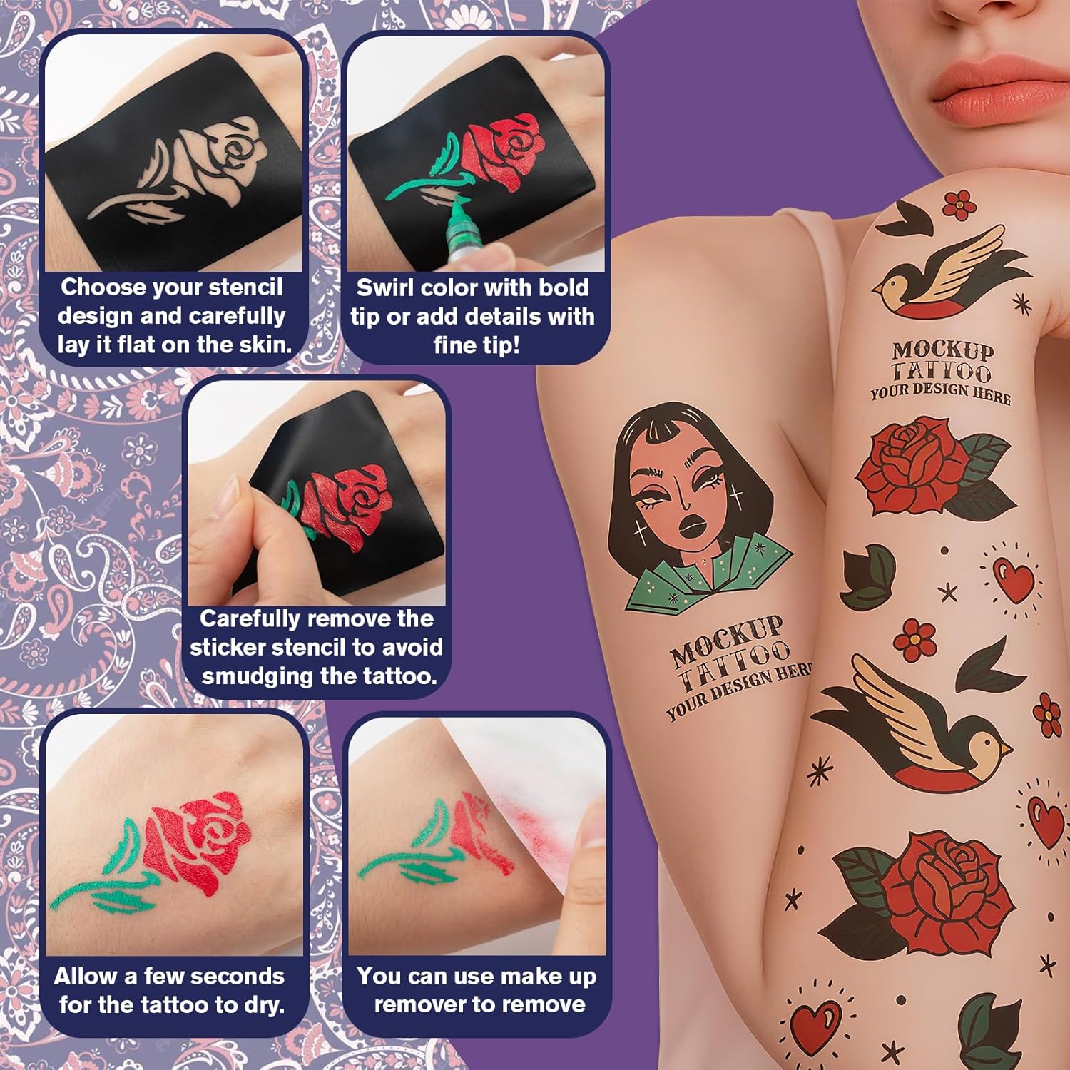 LONG-LASTING & WATER-RESISTANT WEAR – Show off your style for days! Our temporary tattoo markers feature an advanced formula that resists moisture and perspiration, dries quickly, and stays vibrant – keeping your designs perfect throughout the day. These long-lasting tattoo markings maintain their beautiful appearance through all daily activities while remaining easily removable with just soap and water.