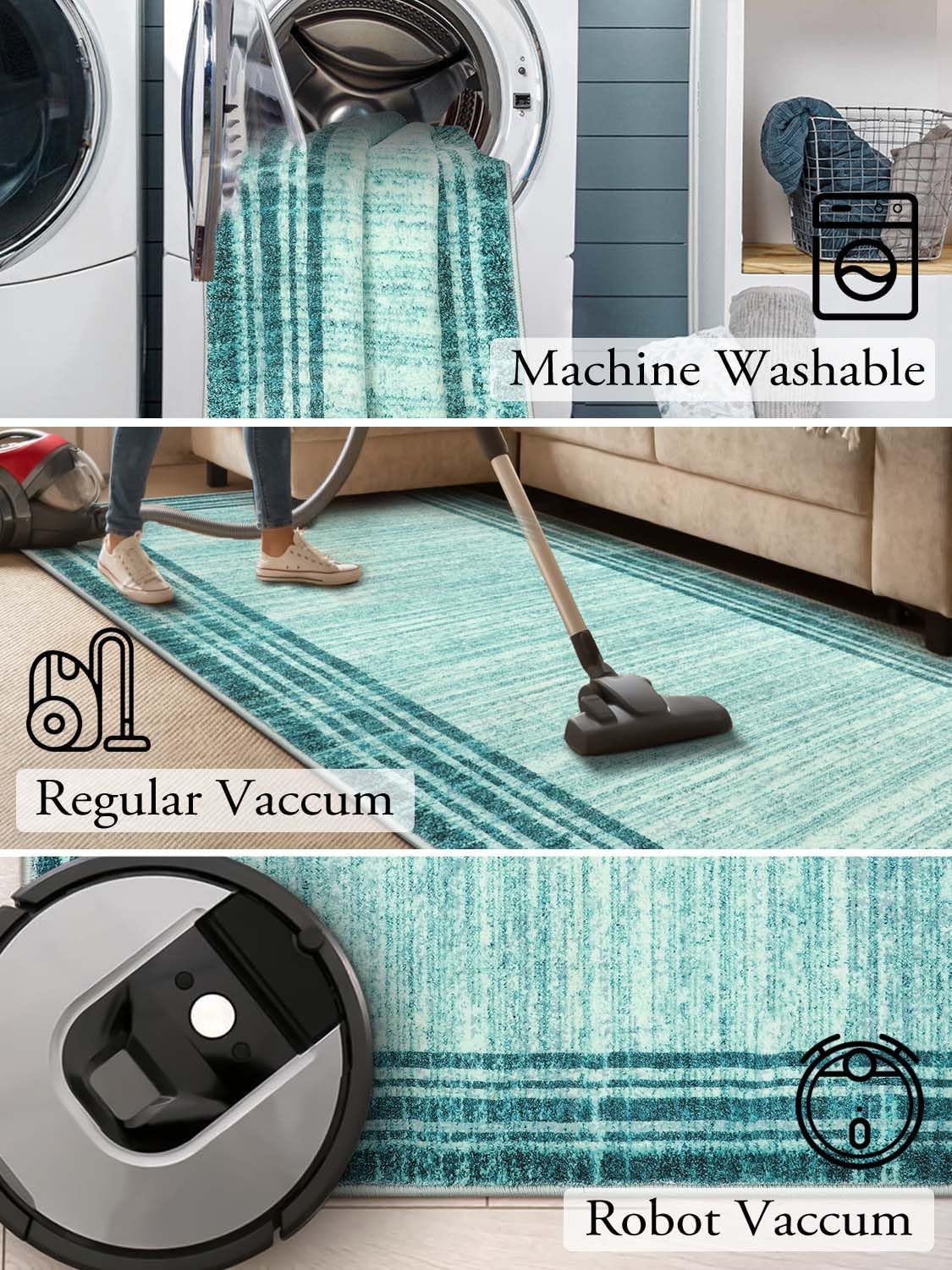 [WASHABLE & EASY MAINTENANCE]: Cleaning and maintenance are a breeze. Runner rugs are machine washable, and low-pile desigh is great for robot vaccum, allowing for deep cleaning maintenance. Large area rugs we recommend regular vaccuming and gently spot cleaning