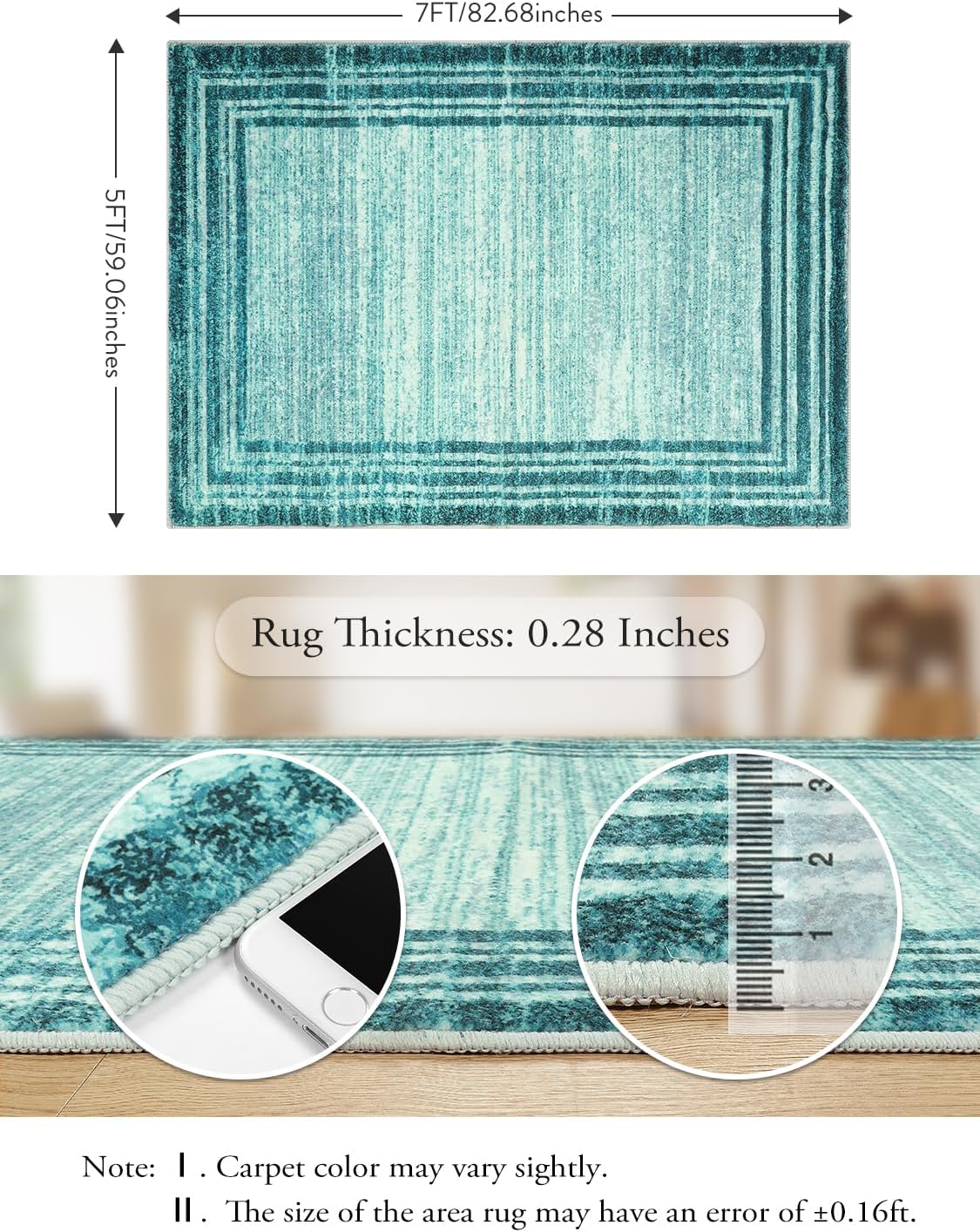 [WARM PROMPT]: The creases may be when arrived because of foldable packaging, put on the ground and place weights for a few days will solve it. Slight difference in colors might be due to the exposure to different lighting conditions; an error of size ± 0.16ft might be as rugs are measured manually