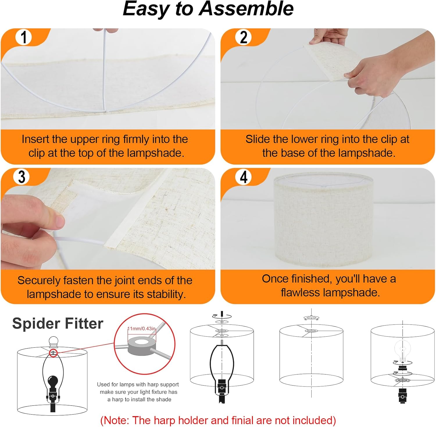Installation Guide: This linen lamp shade is incredibly easy to install, requiring no special skills or tools. Simply place the shade around the metal ring and secure it into the clips. Installation can be completed effortlessly within minutes.