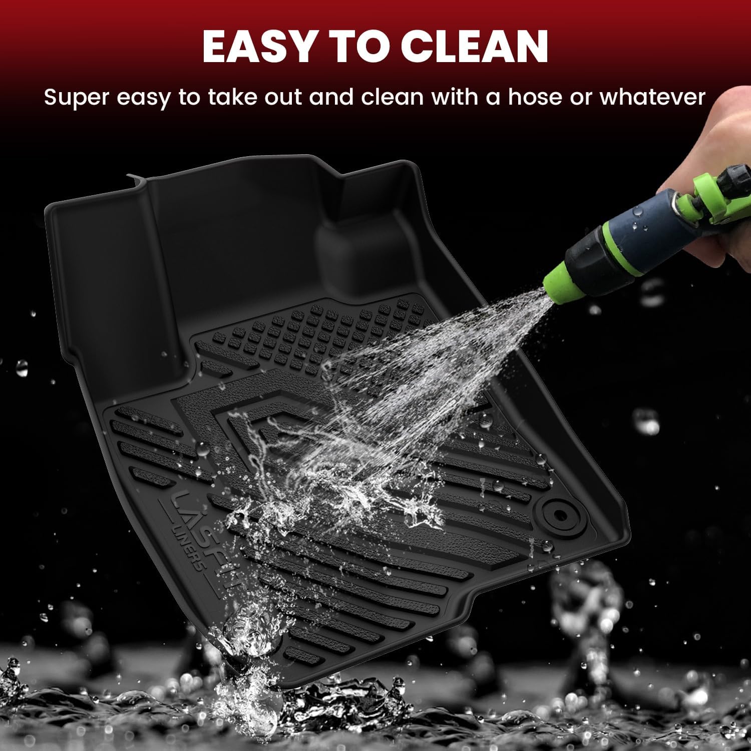 【Easy to Install & Clean】Precise alignment, snaps in place. LASFIT floor liners effortlessly organizes various in-car debris (liquid/crumbs/pet hair/sand). Follow a simple 3-step cleaning method after removal: 1) Shake off or sweep away large particles → 2) Rinse and air-dry → 3) Quick reinstall. Compatible with vacuum cleaning or high-pressure hose rinse, offering instant drying and immediate reuse.
