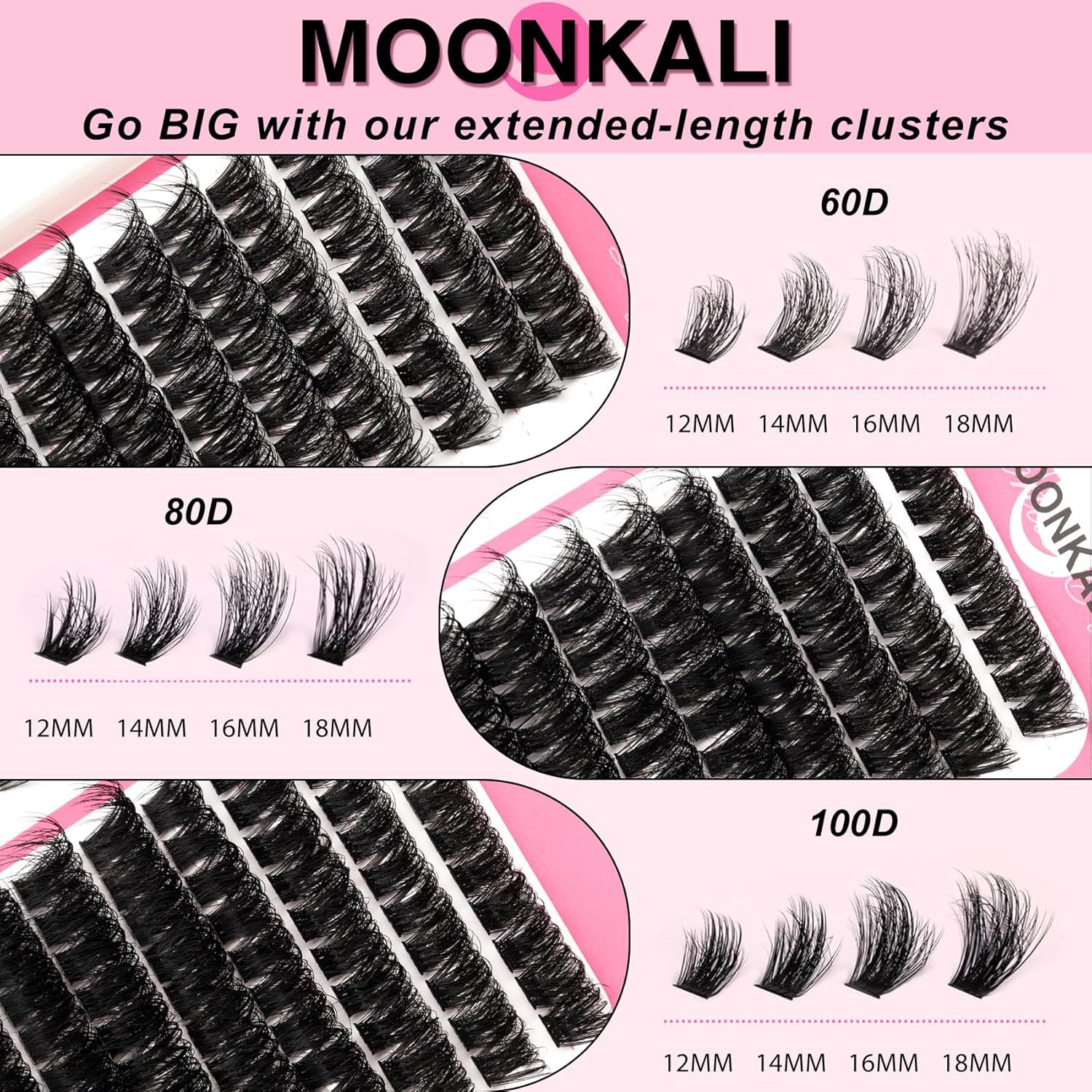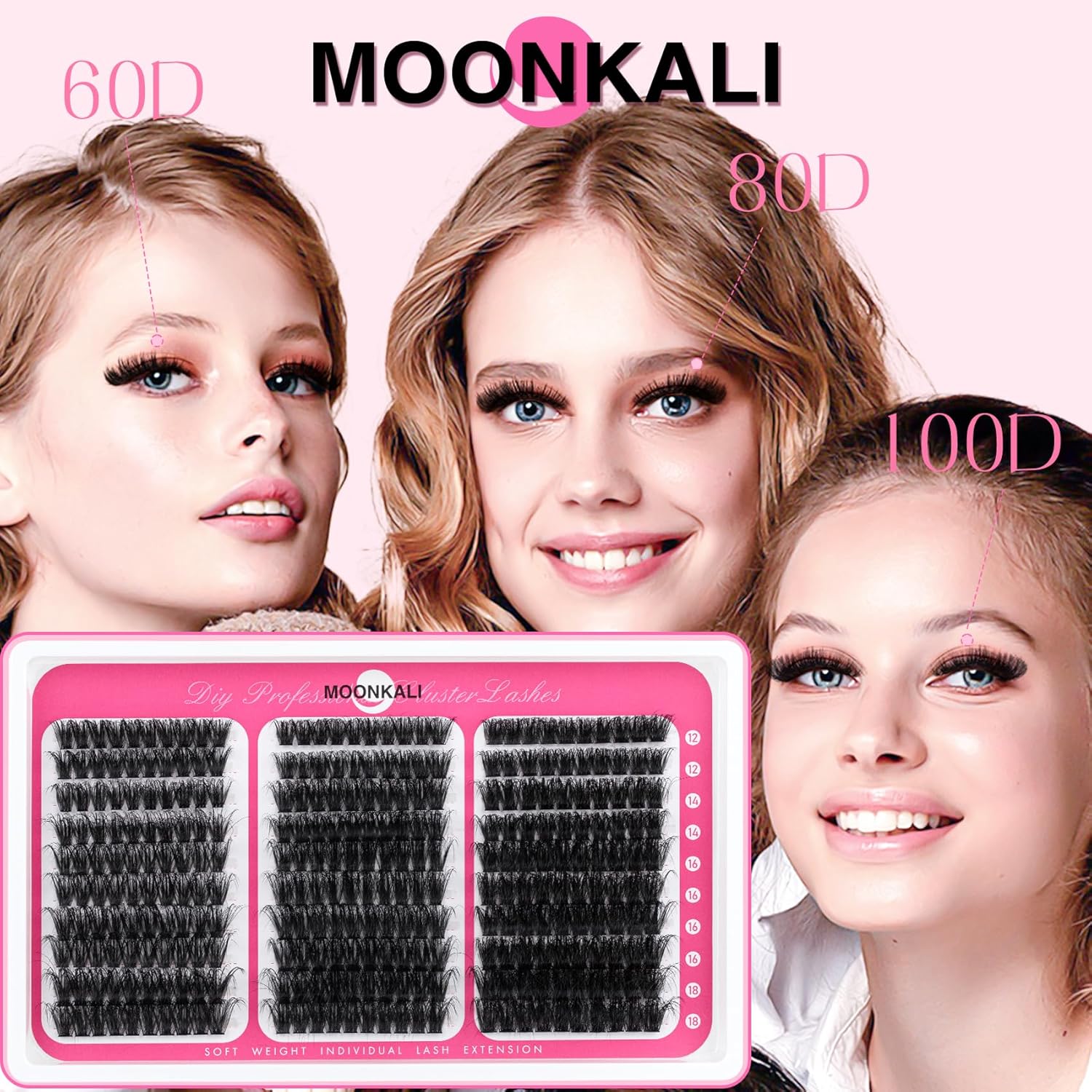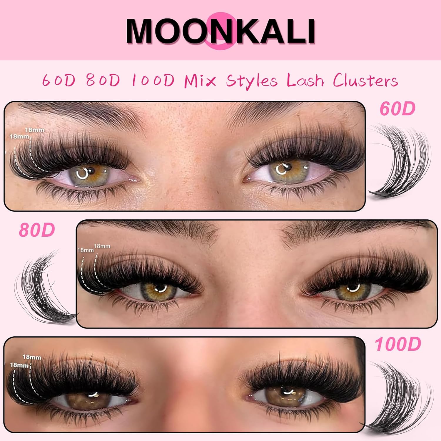 60D, 80D and 100D lash clusters: MOONKALI eyelash clusters include 10 rows of dense D curly cluster eyelash extensions in three styles of 60D, 80D and 100D, with a length of 12 to 18 mm. With ultra-high cost-effectiveness, it enables easy at-home self-application for versatile eyelashes styling