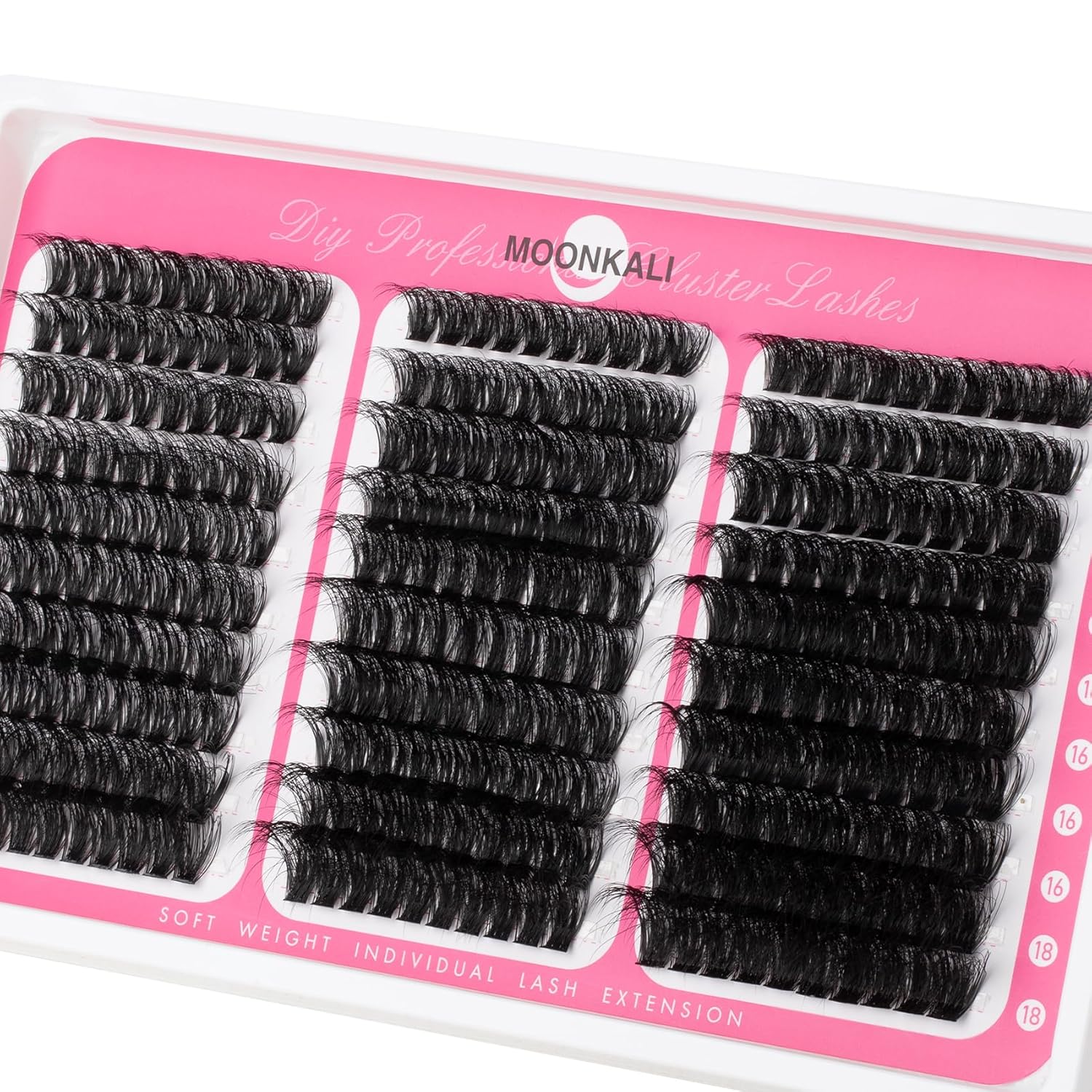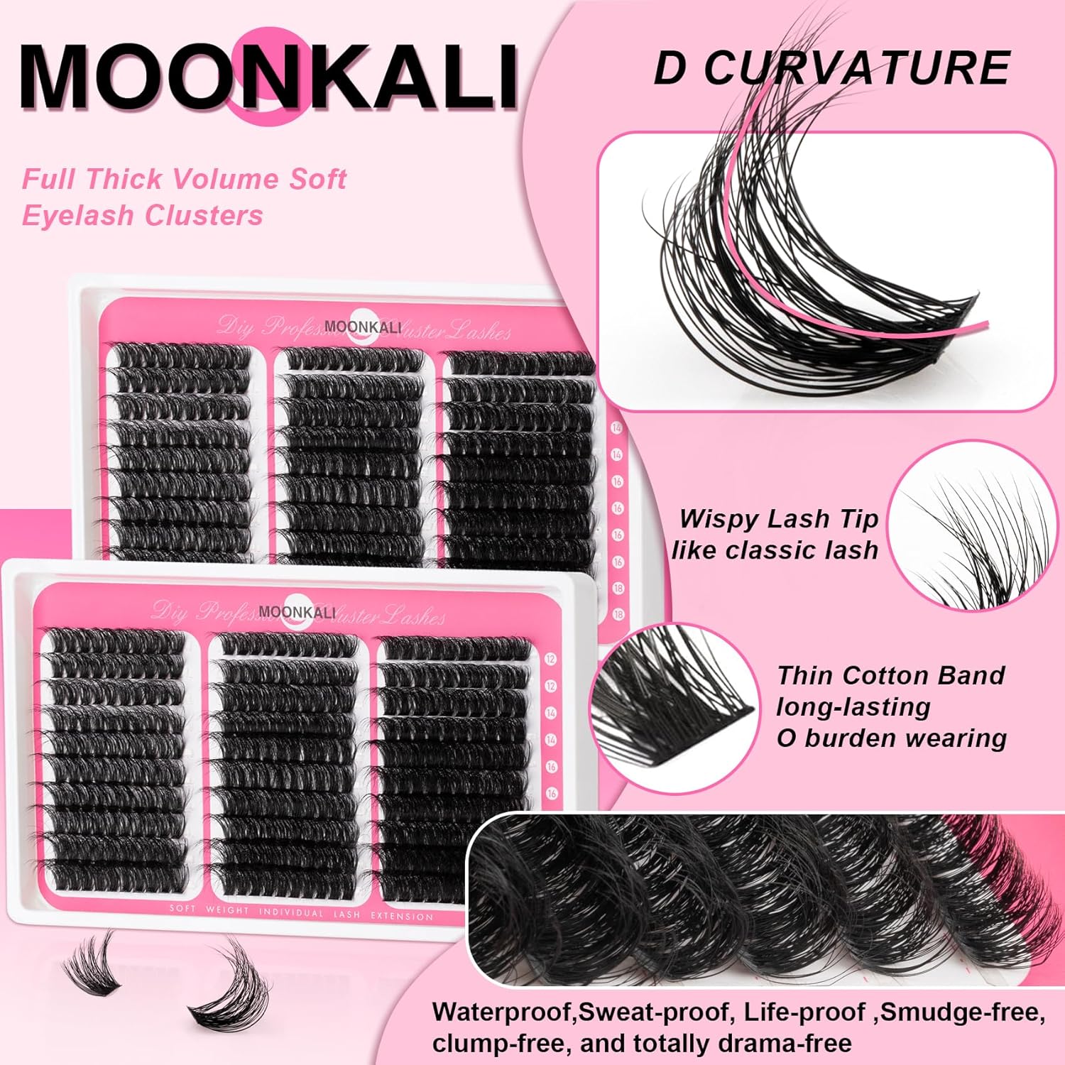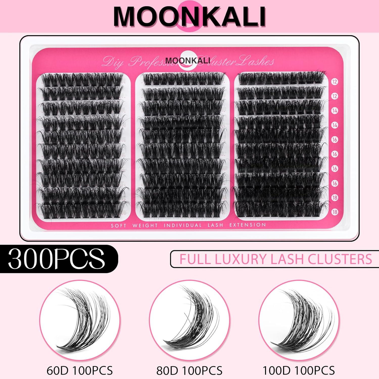 60D, 80D and 100D lash clusters: MOONKALI eyelash clusters include 10 rows of dense D curly cluster eyelash extensions in three styles of 60D, 80D and 100D, with a length of 12 to 18 mm. With ultra-high cost-effectiveness, it enables easy at-home self-application for versatile eyelashes styling