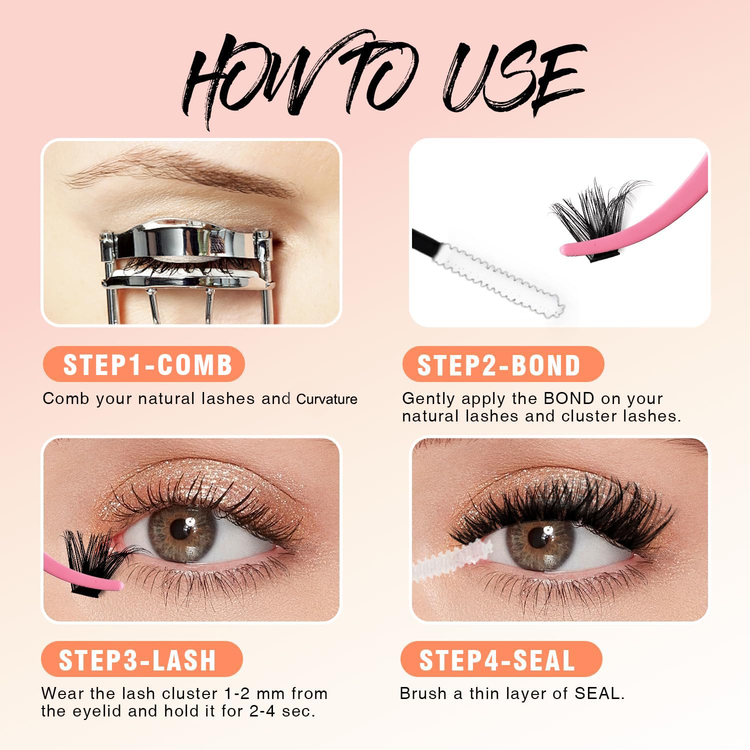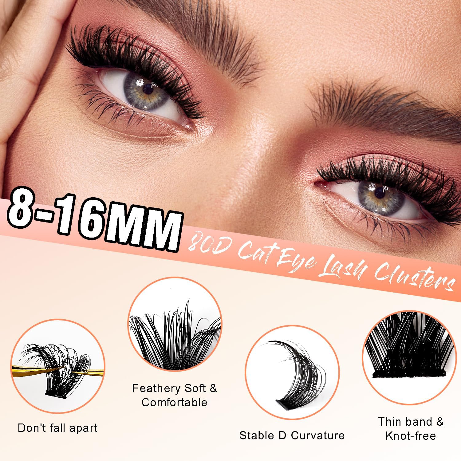 Mixed Cluster Eyelash Extensions: Each row of 80D cluster eyelash extensions contains 9 sizes and is differentiated for use on the left and right eye. This design, featuring cat eye wispy eyelash clusters, allows you to apply clusters lashes faster and more effectively, saving you makeup time. Perfect for beginners, these cluster eyelash extensions make DIY application simple and efficient.