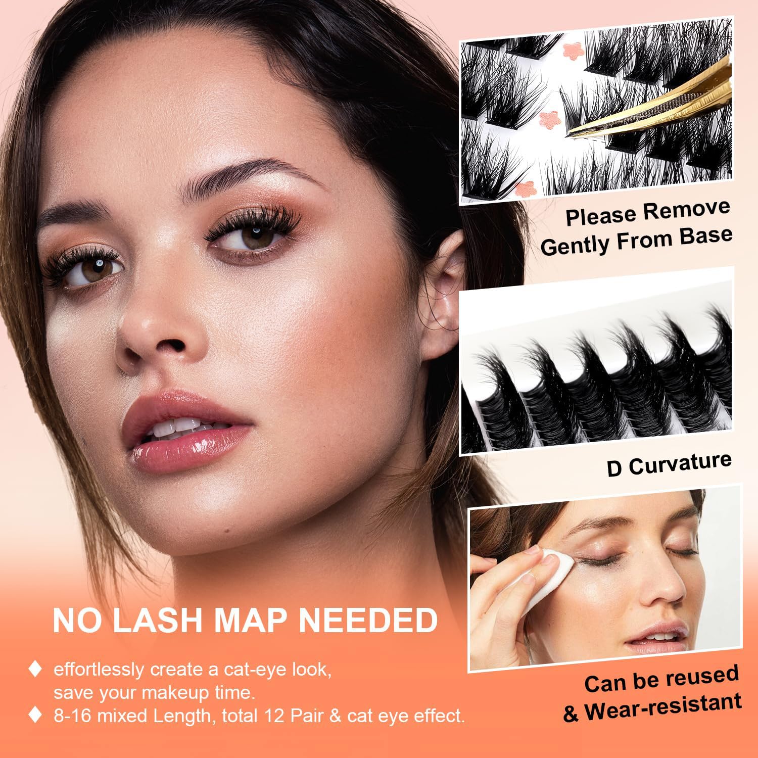 Cat Eye Lash Clusters: Each set includes 12 rows of eyelash clusters, with 18 individual lashes per row, ranging from 8-16mm in length for a cat-eye effect. Pre-mapped for left and right eyes, these lash clusters make it easy and quick to DIY your own lashes, offering a natural yet dramatic look. Perfect for achieving professional-grade results at home.