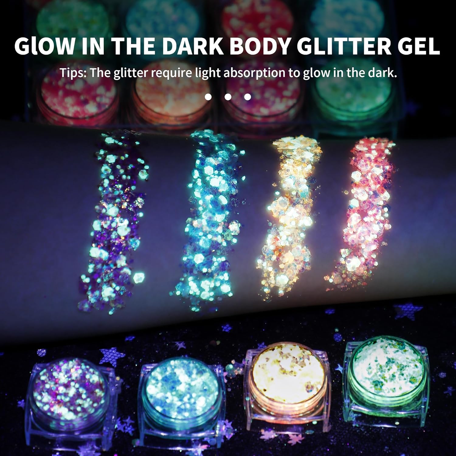 Glow body and face glitter: Self-adhesive, easy and suitable for use on the face or skin. You can use these for face, body, eyes, glitter eyeshadow, cheekbone highlights, collarbones decoration, glitter hair and nail art. Mix and match to show your charm. Comes in 12 Jars(3.5g of each jar). Vibrant colors, holographic shine.