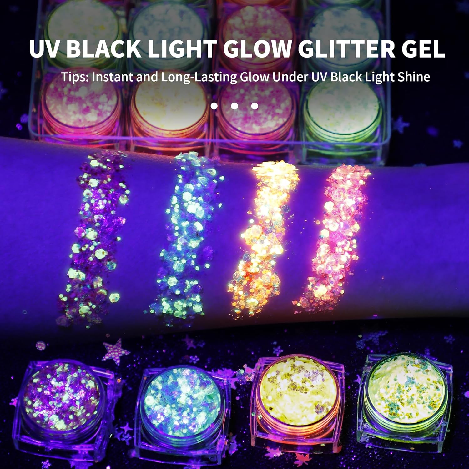 Glow in the dark glitter: Our glow glitter provides your a bright luminance glowing effect after absorbing light, perfect glow in the dark party supplies, UV party supplies. Suitable for nights dancing parties, festivals, clubs, parties, raves, costumes, themed parties and so on.