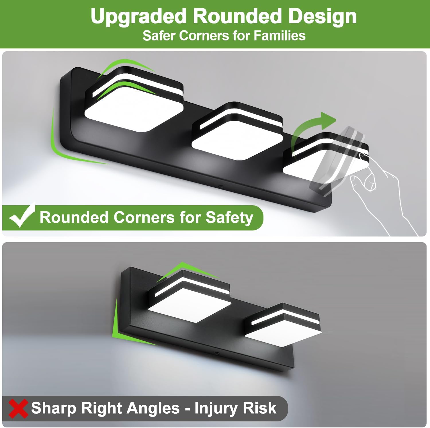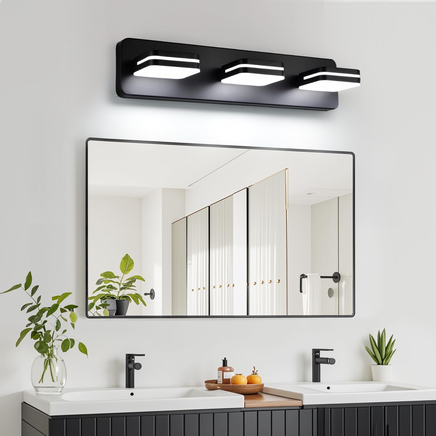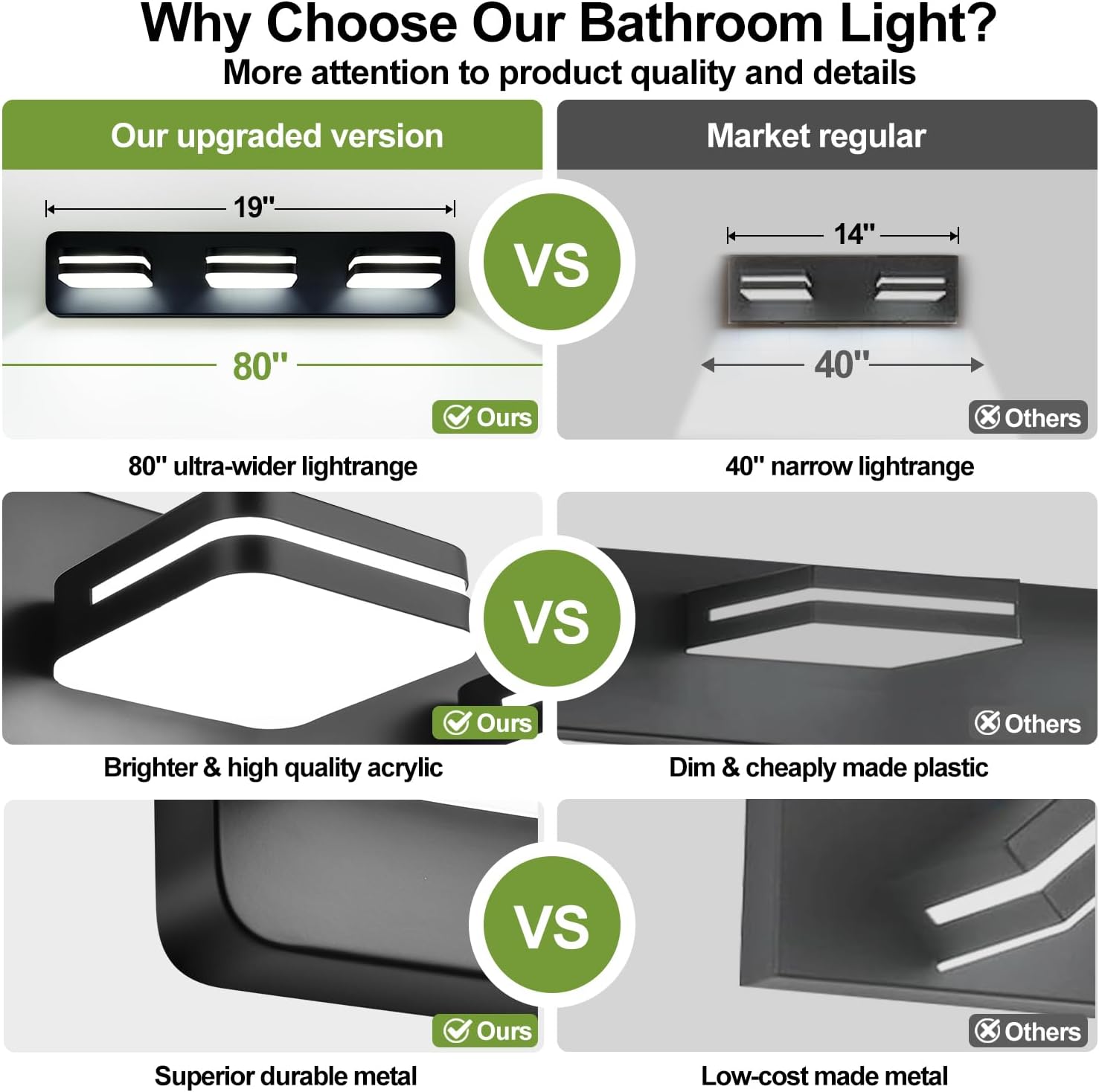 High Quality Material: The vanity lights for bathroom feature a metal black frame with cutting-edge electroplating and precision sealing technology, offering exceptional dust-proof, fog-proof, anti-corrosion, and moisture-proof properties, making it ideal for humid environments. The matte white solid acrylic lampshade is incredibly sturdy and provides soft, glare-free lighting with even distribution. This design not only ensures optimal lighting but also adds a sleek, modern touch to your master bathroom.