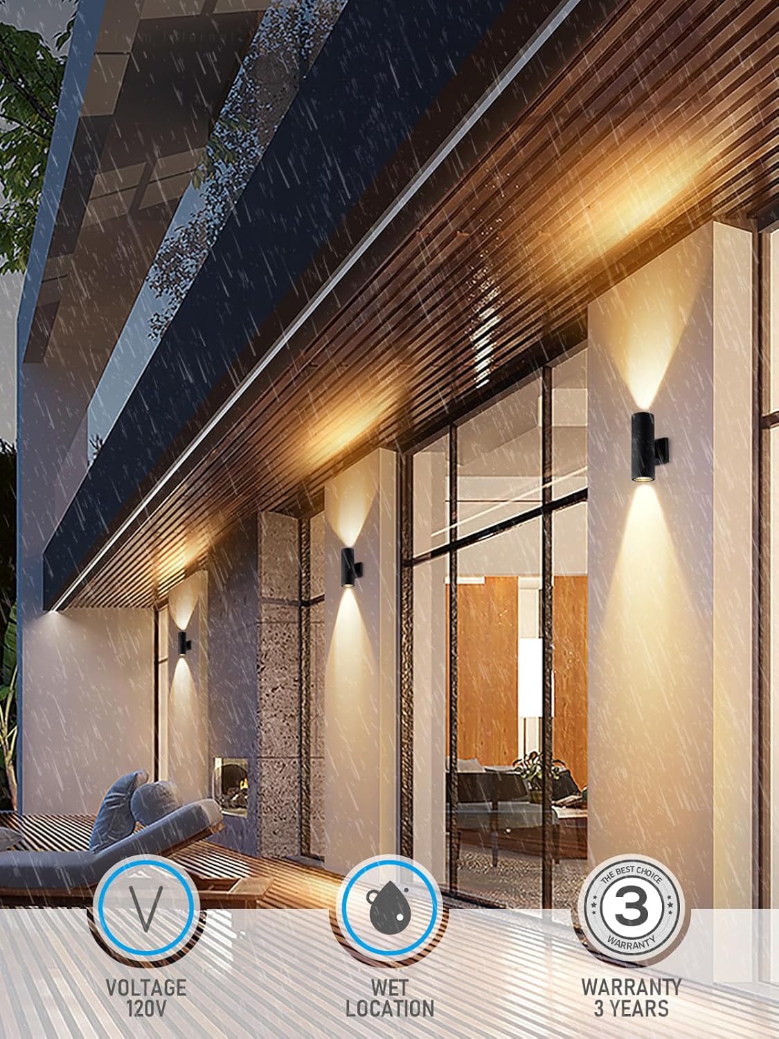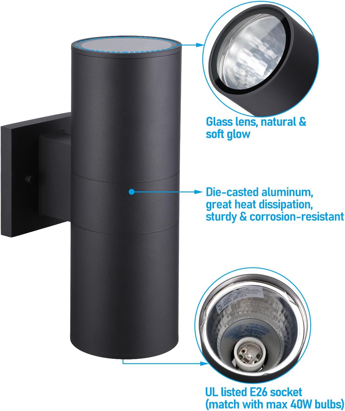 LEONLITE’s cylinder up down wall lamp evenly distributes light upwards and downwards. Light up your walkway, porch, garage, backyard, or patio décor.