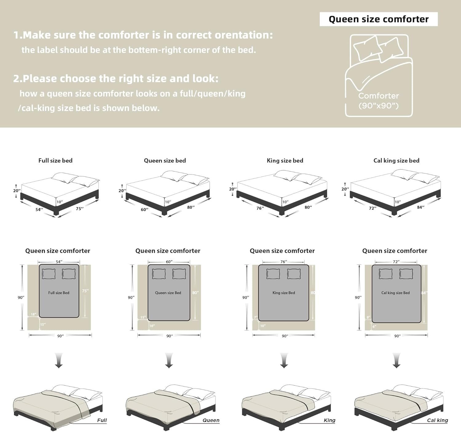 【Package Includes】Queen size comforter set includes 1 comforter (90×90 inches), 2 pillowcases (20×26 inches). Since the comforter comes in vacuum-sealed packaging, it is highly recommended to wash it and tumble dry low temperature to puff the comforter before first use. Or you can expose it to sunlight and tap gently, then it will re-fluffed nicely after hours.