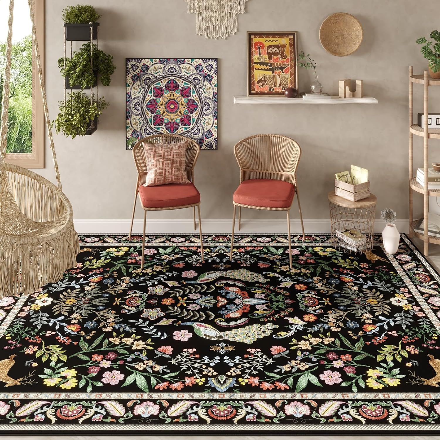 Living Room Rug 5×7 Rug Machine Washable Area Rug Floral Non-Slip Low Pile Large Rugs for Living Room, Bedroom, Farmhouse, Dining Room, Kids Playroom (Vibrant Black)