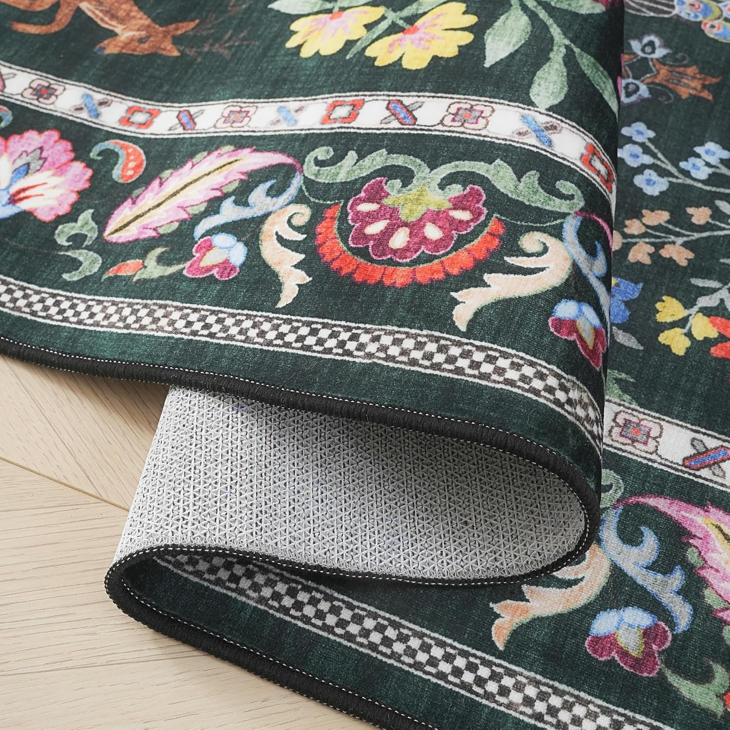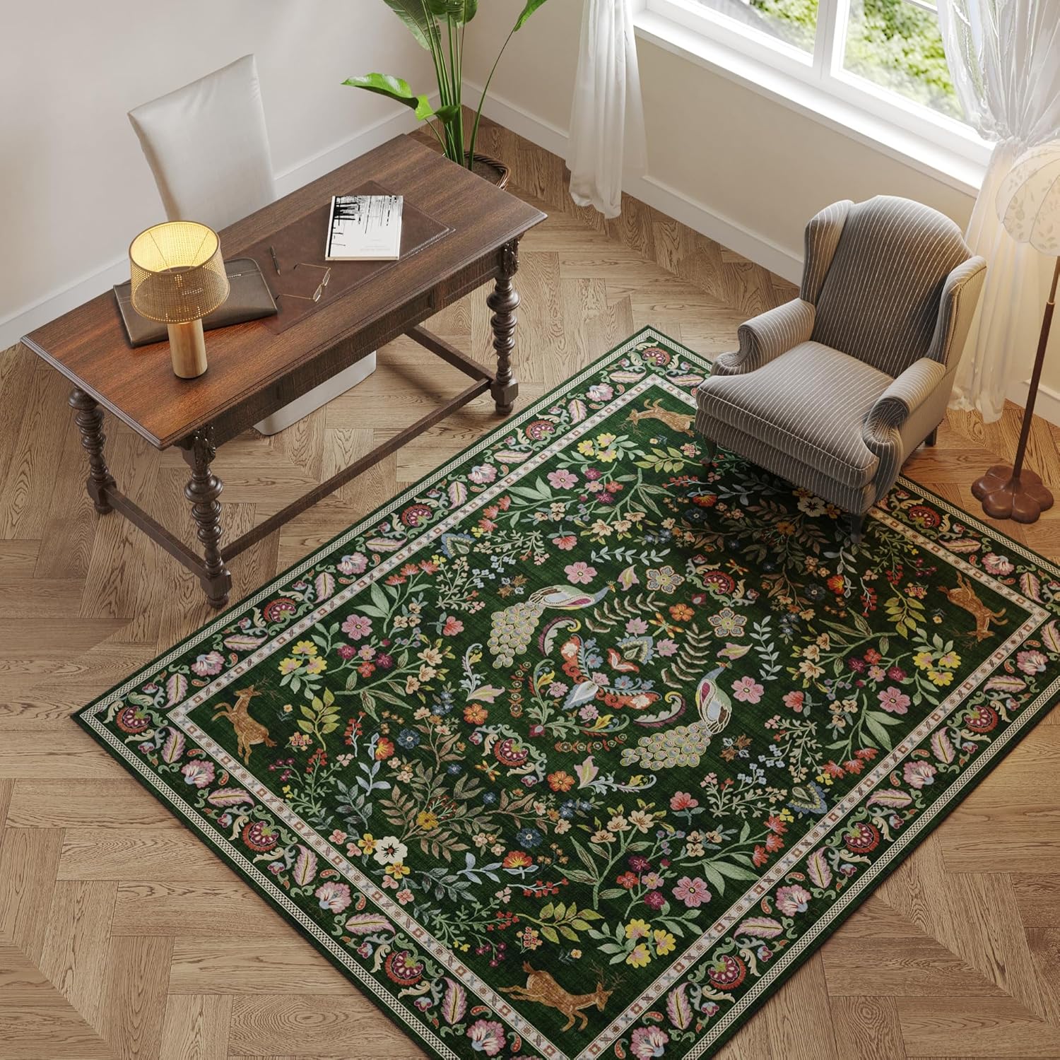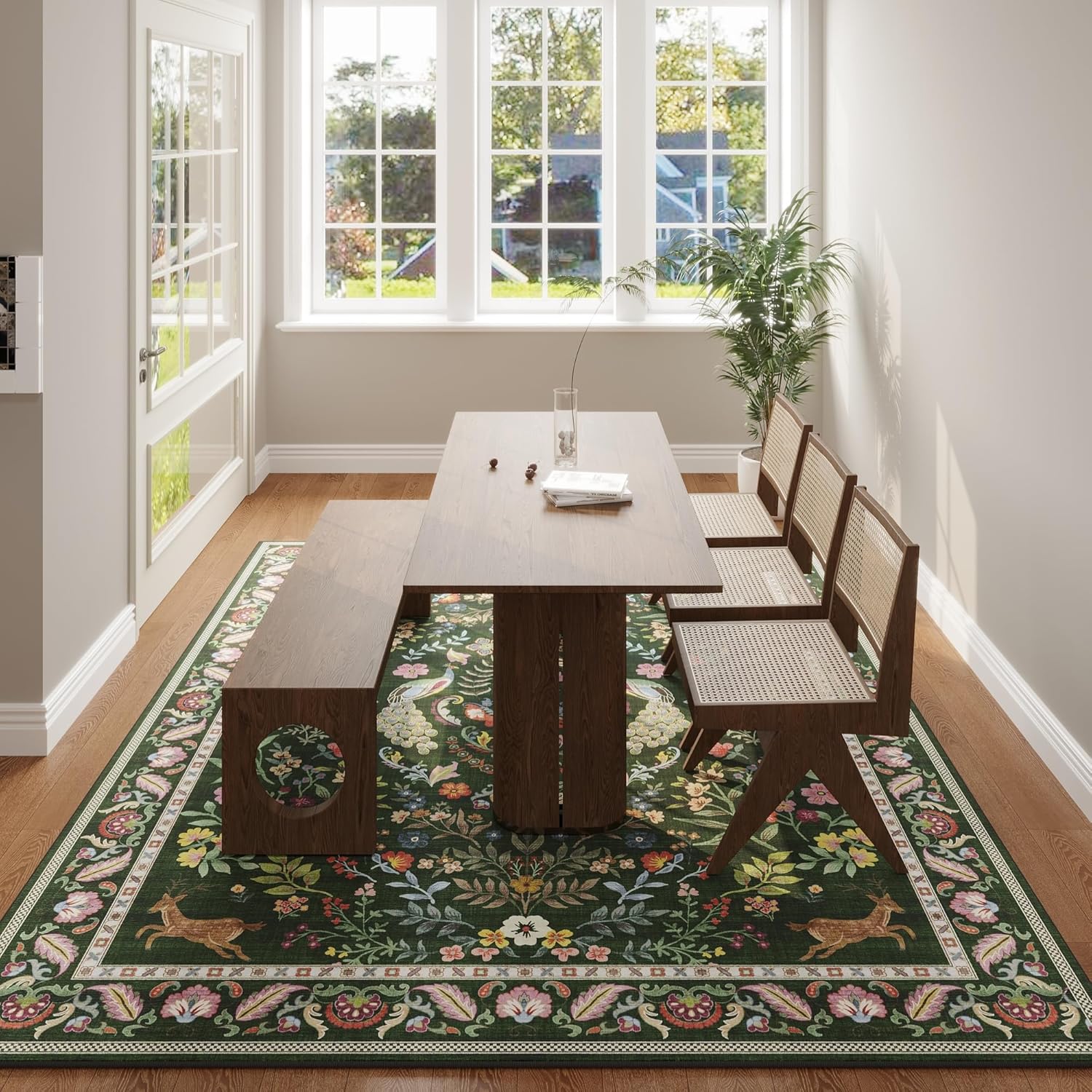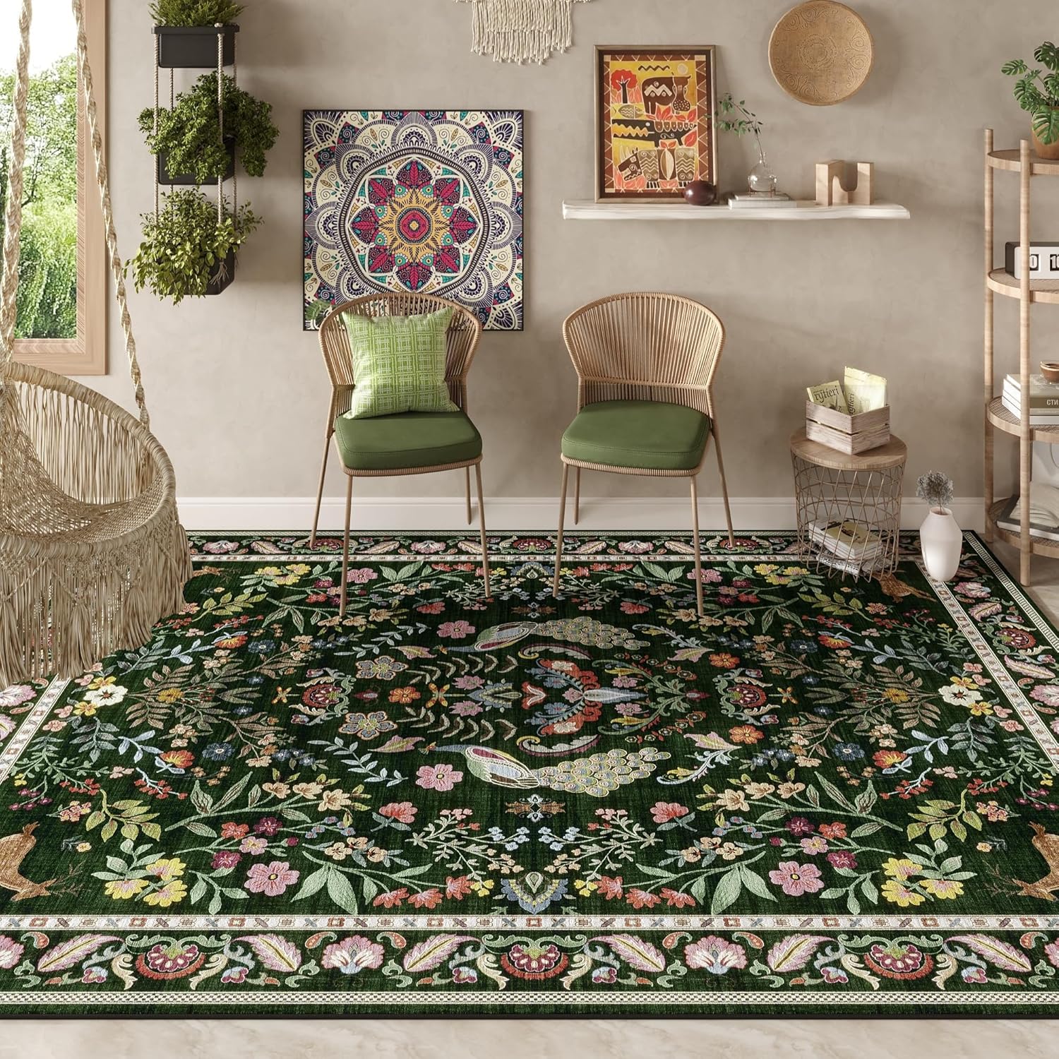 Living Room Rug 6×9 Rug Machine Washable Area Rug Floral Non-Slip Low Pile Large Rug for Living Room, Bedroom, Farmhouse, Dining Room, Kids Playroom (Emerald Green)