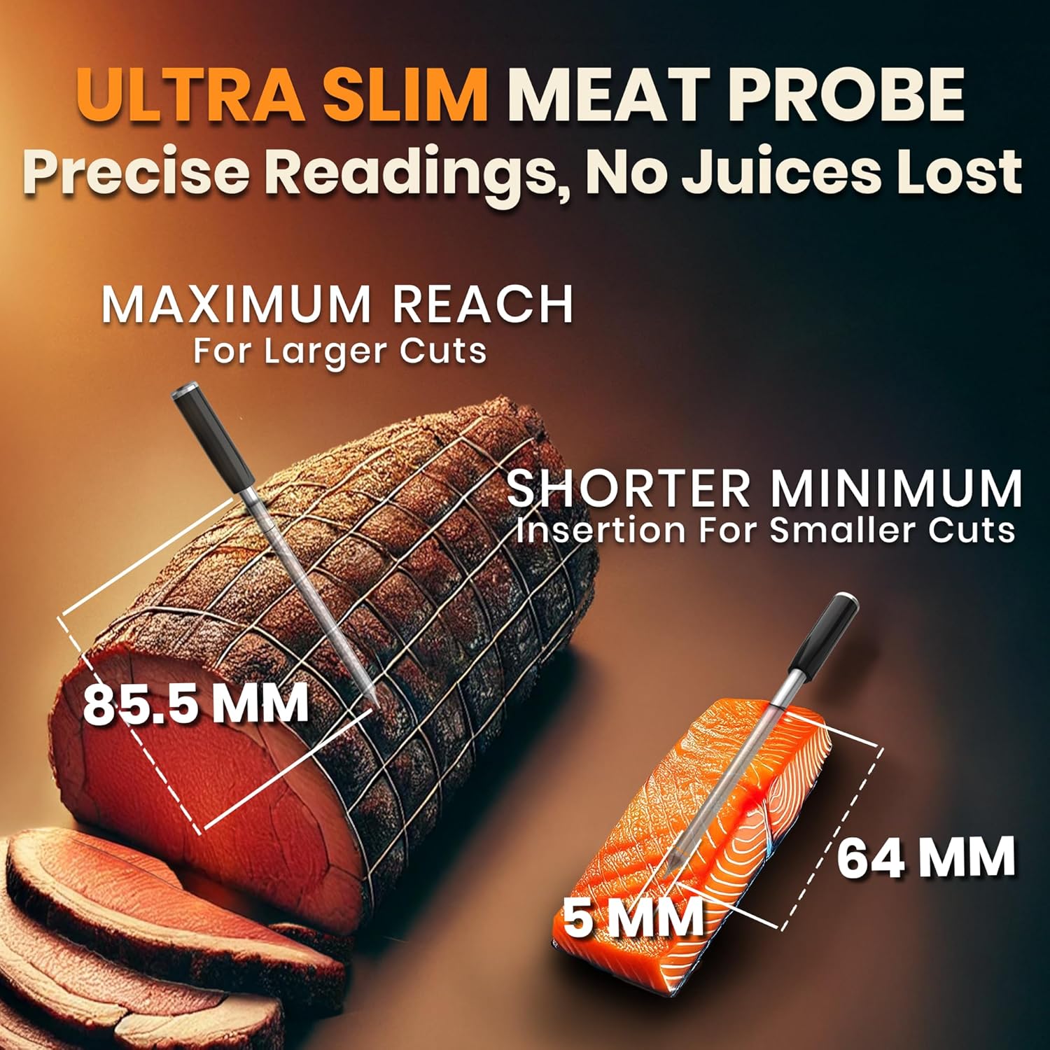 Ultra-Slim, Deep-Reach Design: About 5 mm thin with 9.5 cm insertion depth. Fits small steaks and large roasts without getting in the way.