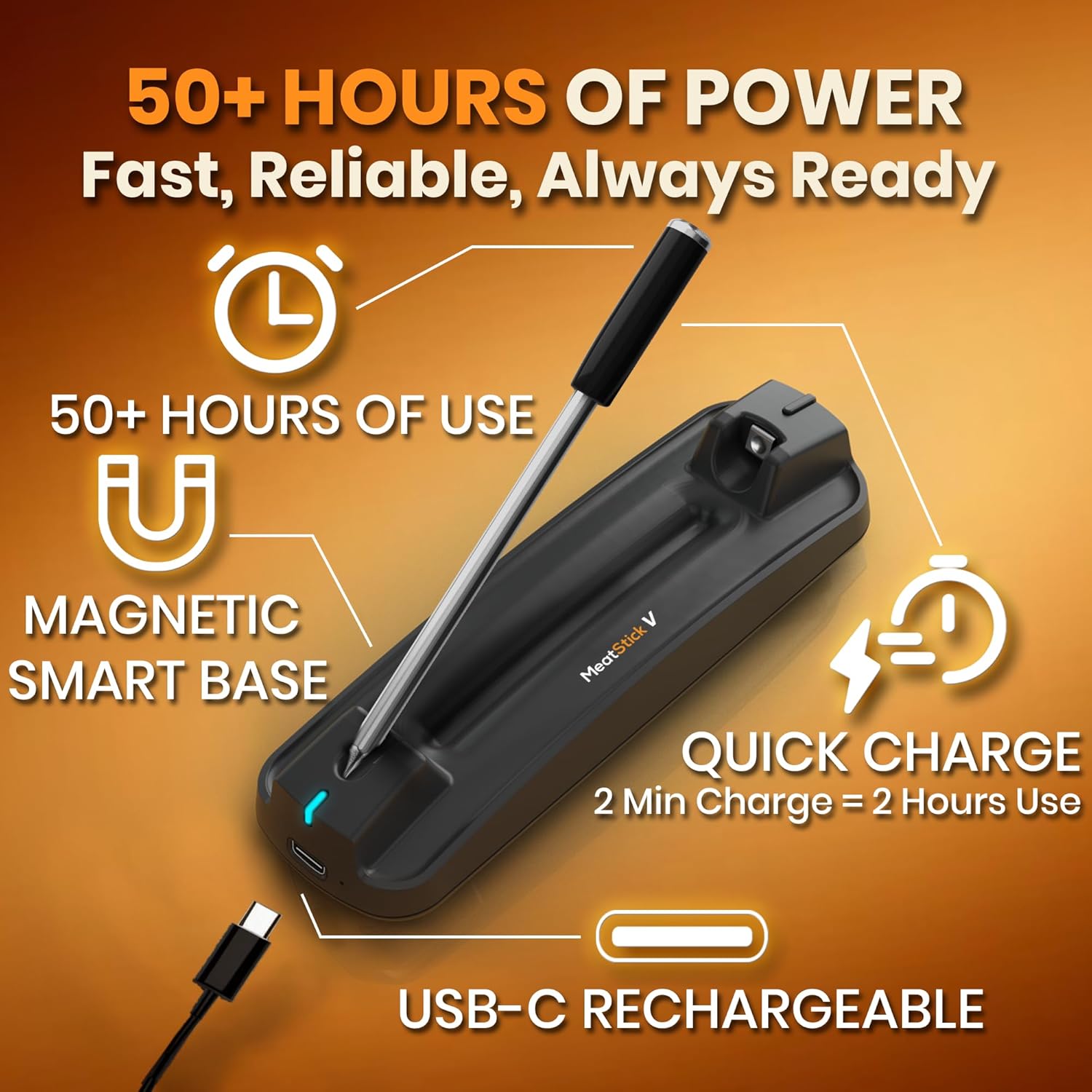 Fast Charge, Long Sessions: 2-minute quick charge covers short cooks, a full charge is ready for long smokes. USB-C charging base mounts magnetically.