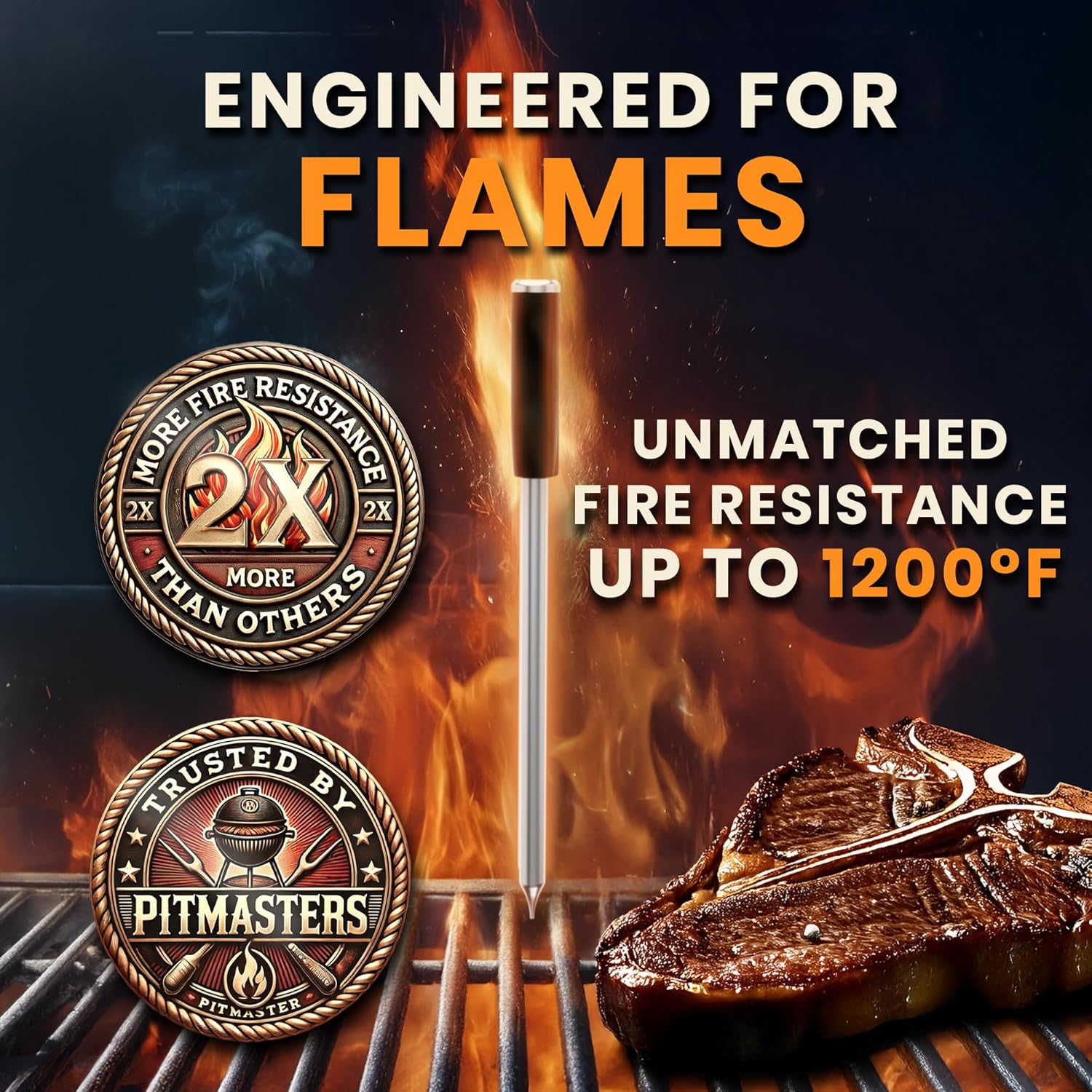 Extreme High Heat: Built for open flame. The probe withstands up to 1200°F for searing, cast iron, broilers, and high-heat grills.