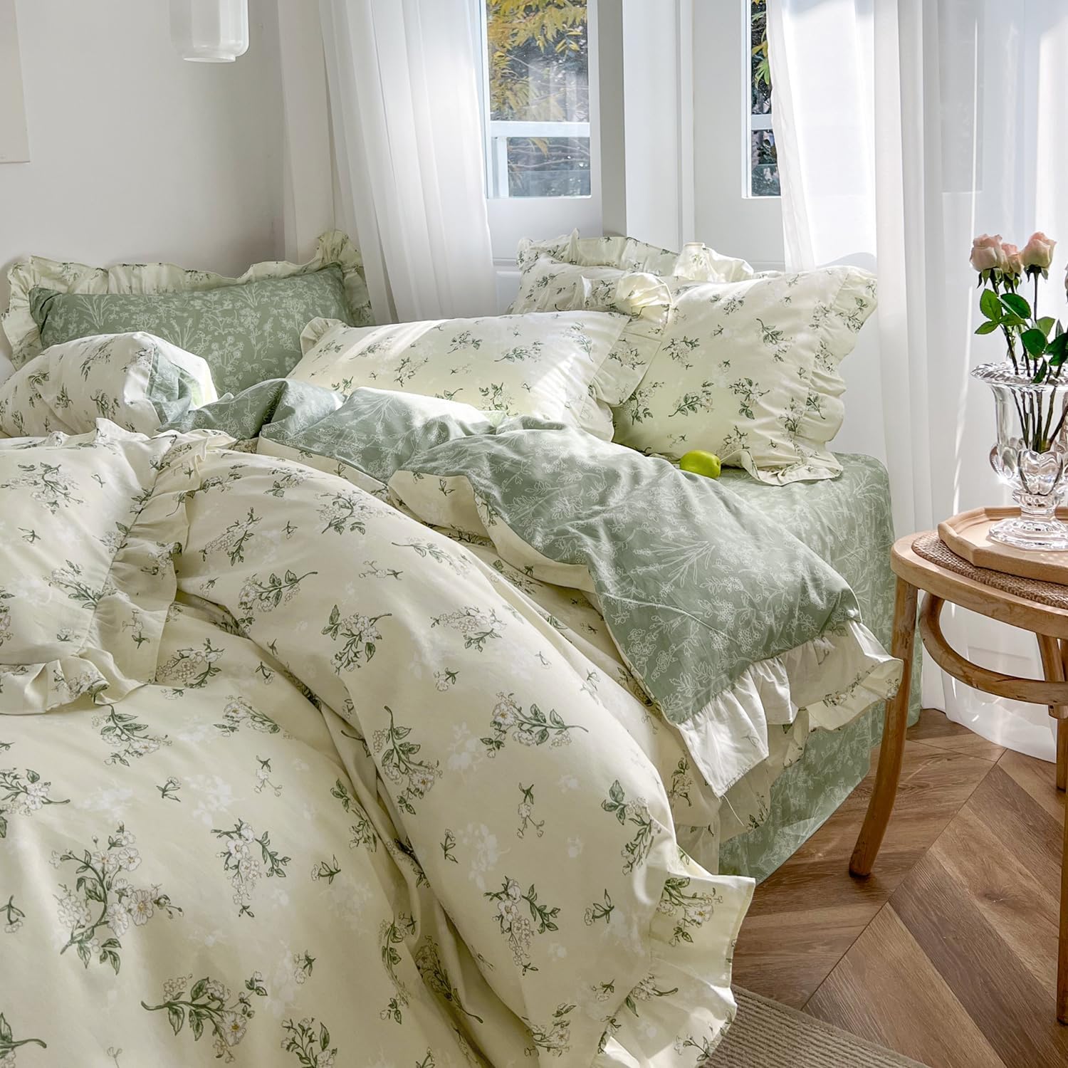 Elegant Design: Featuring a beige background with green leaf and floral patterns, this comforter set adds a touch of vintage boho charm to your bedroom. The ruffled lace edges and reversible design offer versatility, allowing you to switch up your style effortlessly.