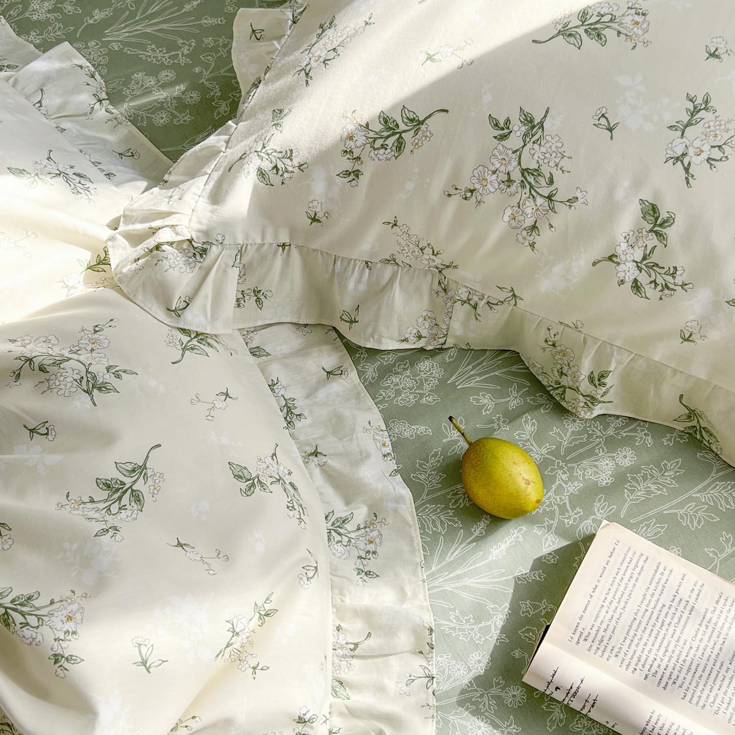 🌼Elegant Beige & Green Design – Features a delicate beige background with lush green leaf and floral patterns, accented with ruffled edges for a vintage boho charm. The ultra-soft cotton comforter showcases a petite flower leaf print, adding a pop of color to brighten your space—perfect for cottagecore and farmhouse-inspired decor lovers.